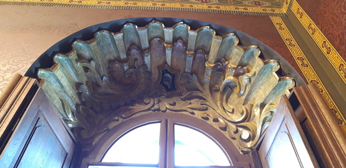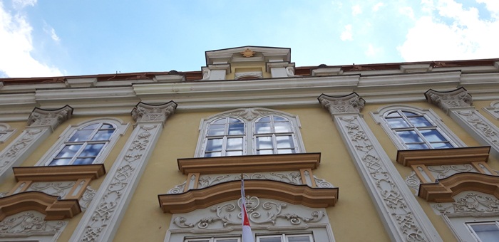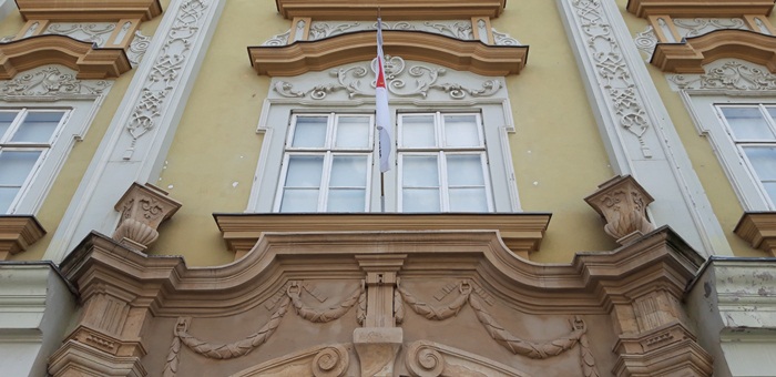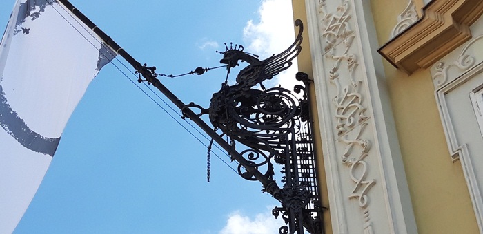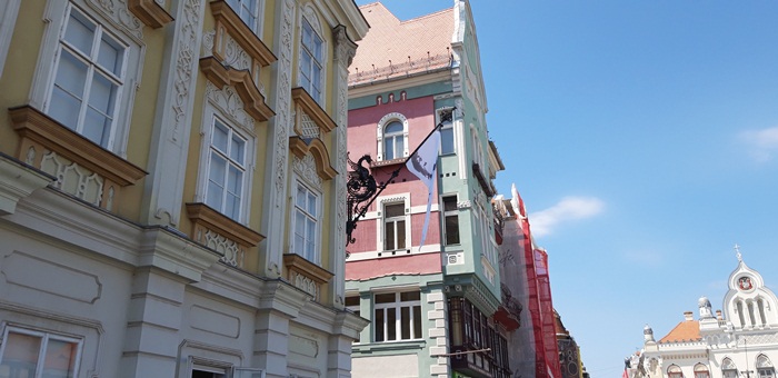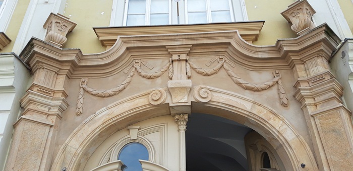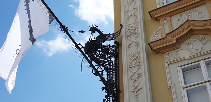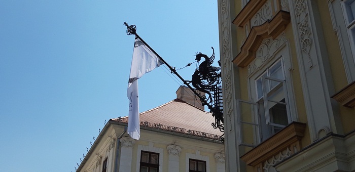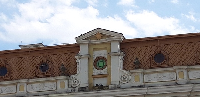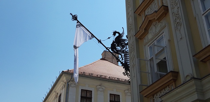 Tot Jakob Klein este “responsabil” si pentru portdrapelele din exterior, postate in cele doua colturi ale cladirii, pe fatada dinspre Piata Unirii, ce pot fi admirate si astazi.