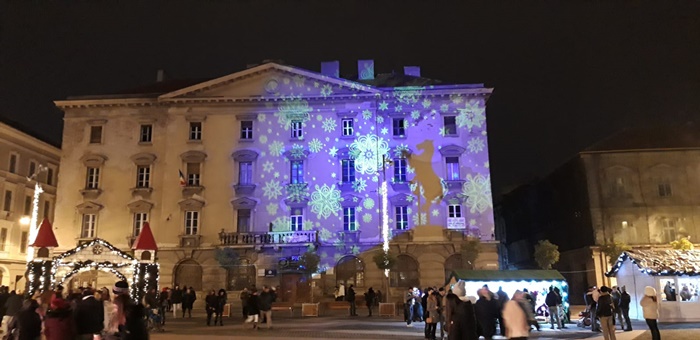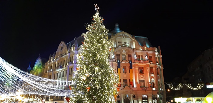 In premiera, in Piata Libertatii pe cladiri sunt proiectii cu fulgi de zapada si au fost iluminati stejarii din fata Garnizoanei, plantati de Regele Ferdinand si Regina Maria.
