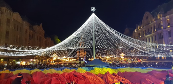 TIMISOARA. Atmosfera de sarbatoare la Timisoara. In seara zilei de 1 Decembrie, Piata Victoriei si-a schimbat infatisarea, odata cu aprinderea iluminatului festiv. A fost deschis oficial si Targul de Craciun din centru in acest an.