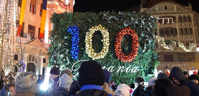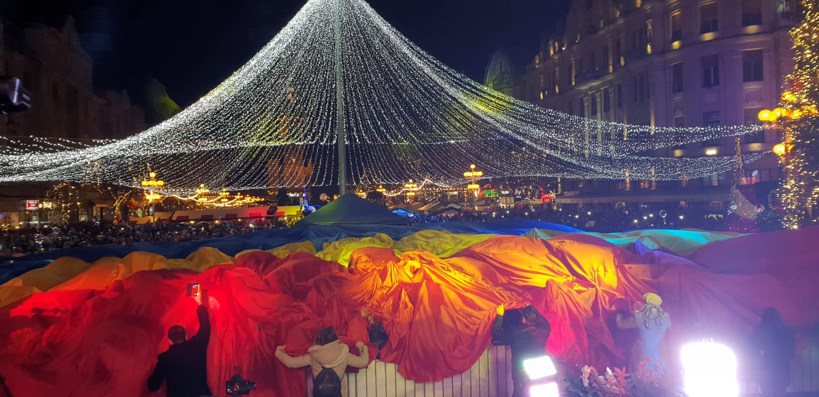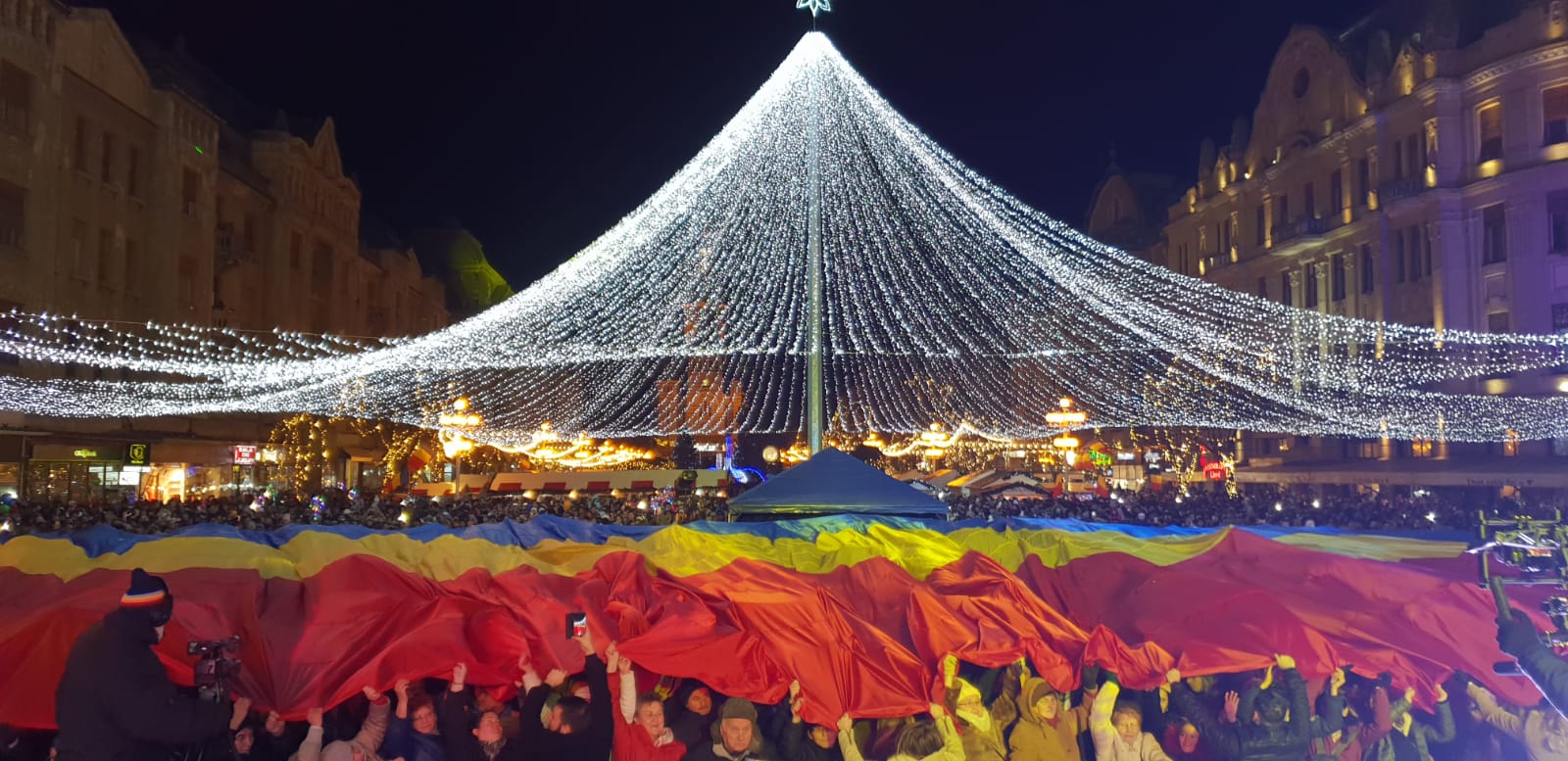 Un tricolor urias a fost adus in Piata Victoriei si fluturat peste captele celor prezenti in uralele multimii. Momentul a marcat Centenarul Marii Unirii in plin centrul Timisoarei, in urari de La Multi Ani, Romania!