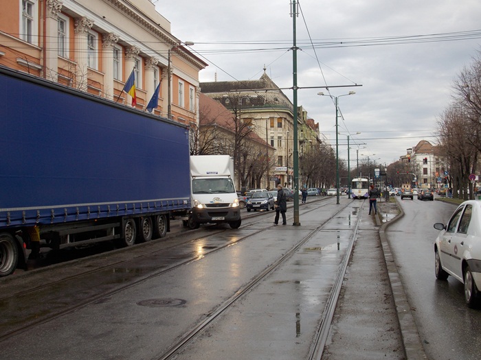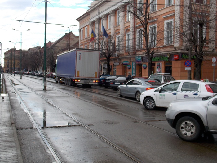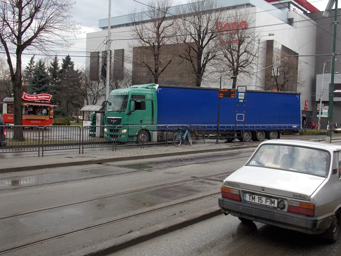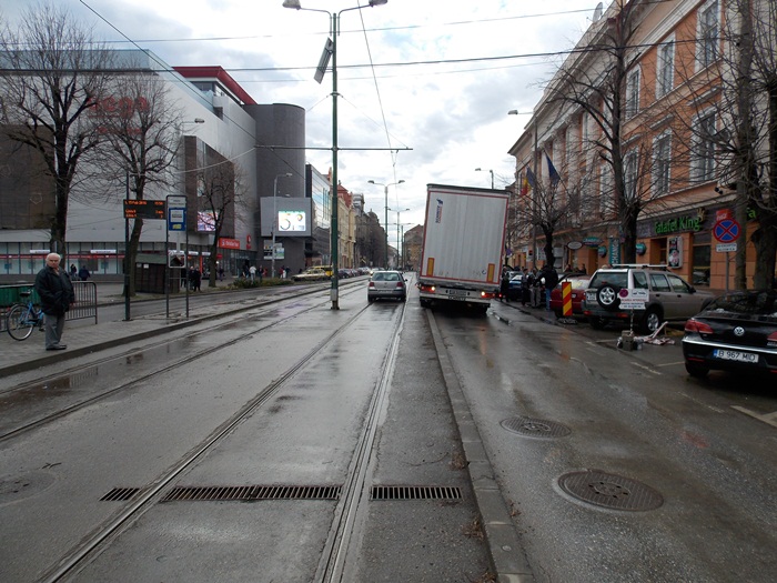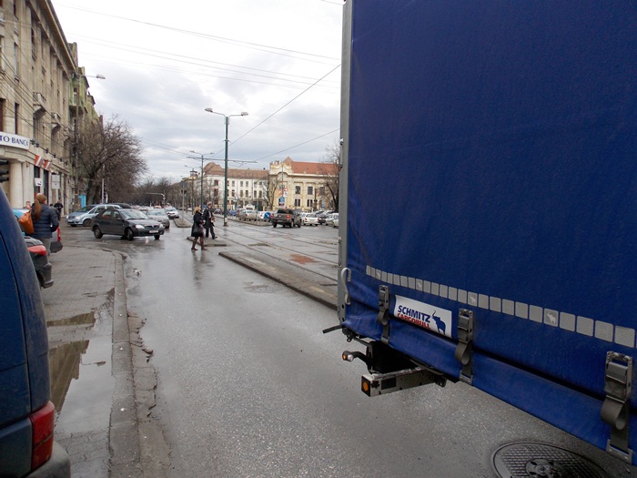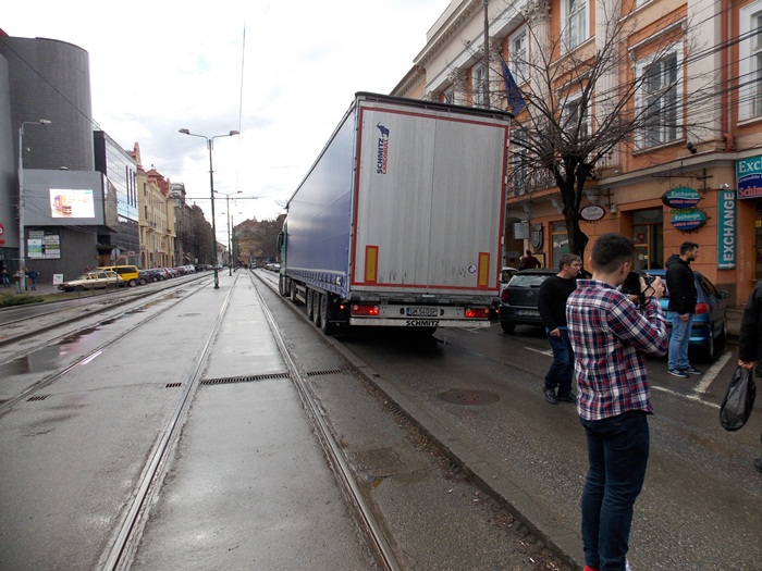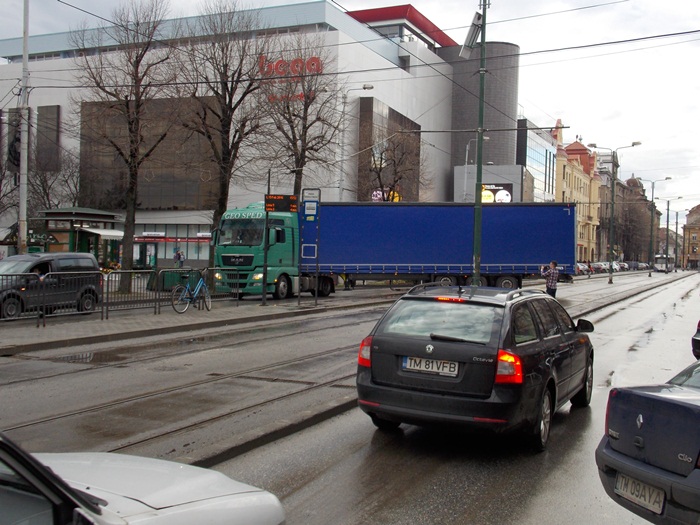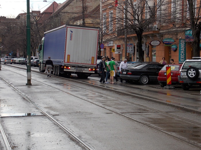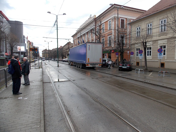 Cand si-a dat seama ce s-a intamplat, soferul de tir a oprit mastodontul in dreptul intersectiei cu Augustin Pacha. Traficul in zona a fost dat peste cap, in spatele tirului formandu-se coloana de masini. Unii soferi, s-au urcat in cele din urma pe bordura ce separa carosabilul de linia de tramvai si si-au continuat drumul peste sine.