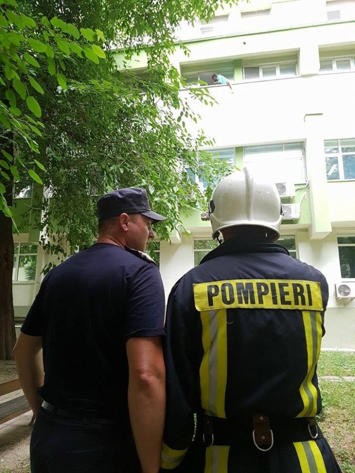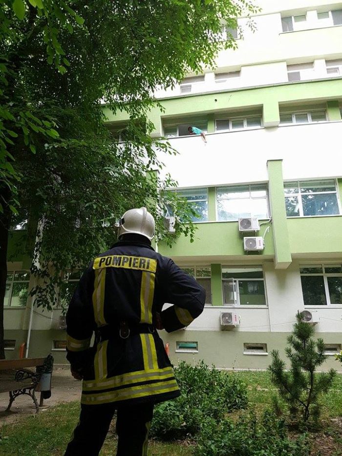 Un echipaj de la pompieri a ajuns in mare graba in salonul de la etajul al doilea, de la sectia de Terapie Intensiva, unde se afla barbatul care ameninta ca se sinucide si incearca sa il convinga sa renunte la gestul necugetat.