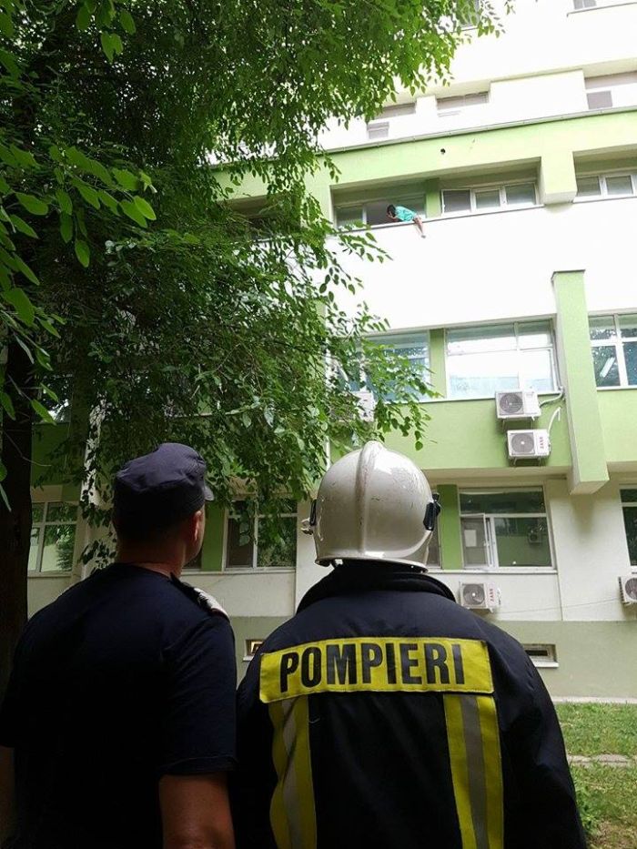 Barbatul, care a incalecat un balcon, se pare ca este pacient al Spitalului Judetean Timisoara.