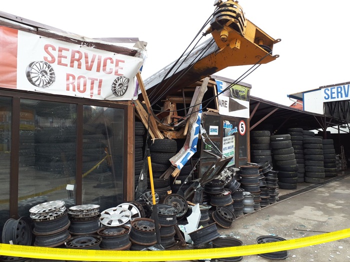 Totul s-a intamplat la Dumbravita pe strada Conac nr. 5, unde, nu se stie din ce motiv, macaraua s-a daramat peste cladirea care adaposteste atelierul de reparatii auto. In cadere, aceasta a sectionat imobilul, pagubele fiind insemnate.