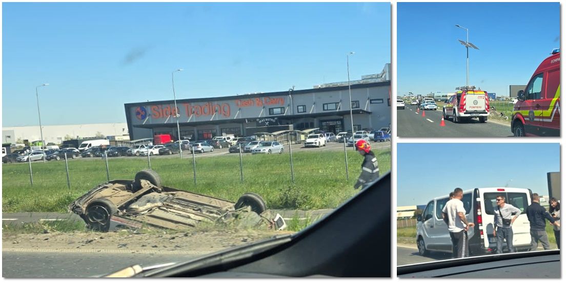 TIMIȘOARA. O mașină a fost răsturnată cu roțile în sus, la ieșire din Giarmata, înspre Dumbrăvița, după ce șoferul altui autoturism a izbit-o din spate.