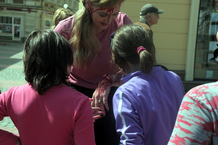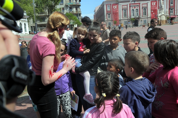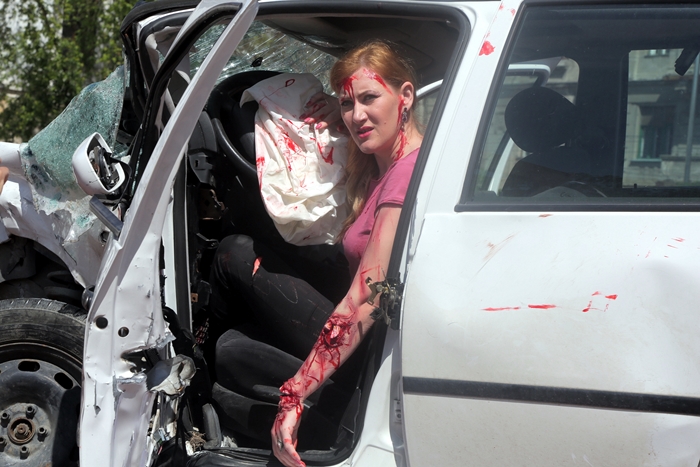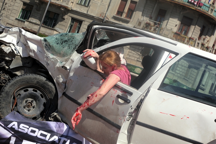 Intre fiarele contorsionate ale autoturismului afla o „victima” accidentata mortal, rol jucat de jurnalista Diana Mihai, careia i s-a aplicat un machiaj profesionist, efectuat de make-up artist si efecte speciale Daniela Casuneanu, astfel fiind prezentate publicului imagini cat mai apropiate celor rezultate din tragedii rutiere.