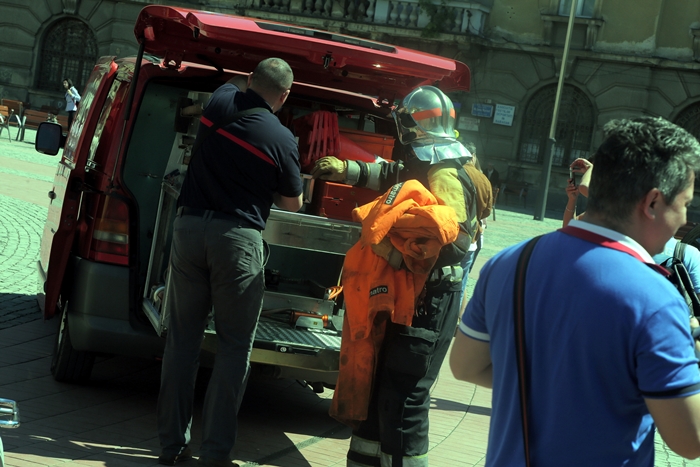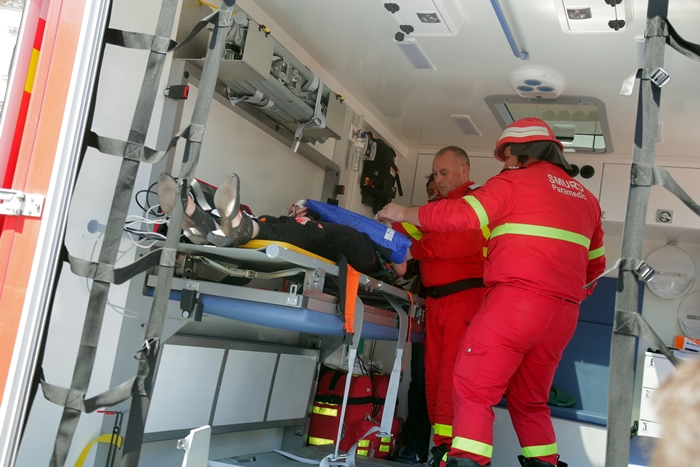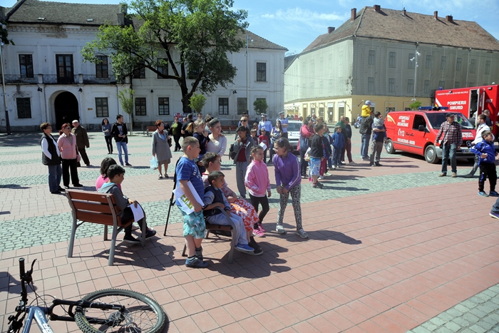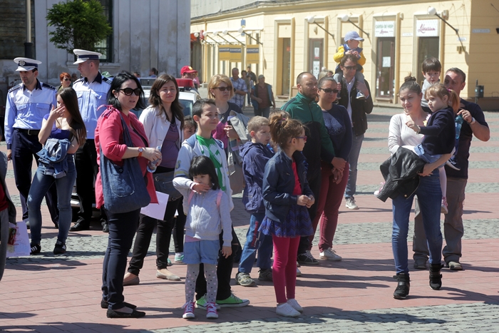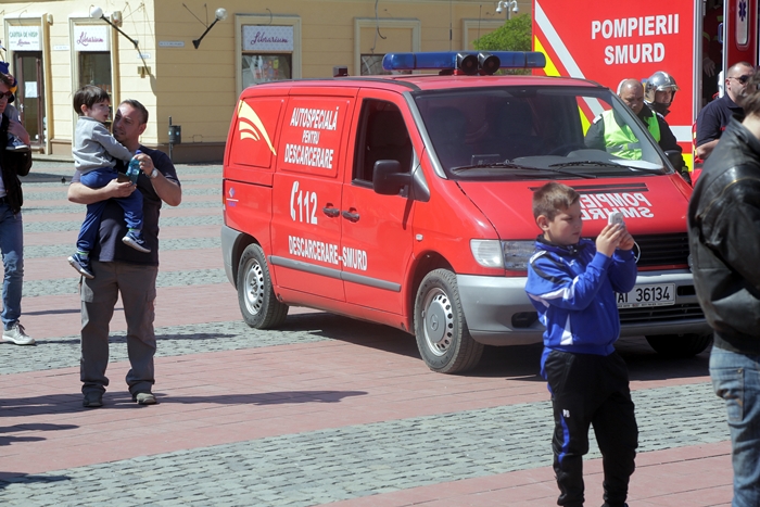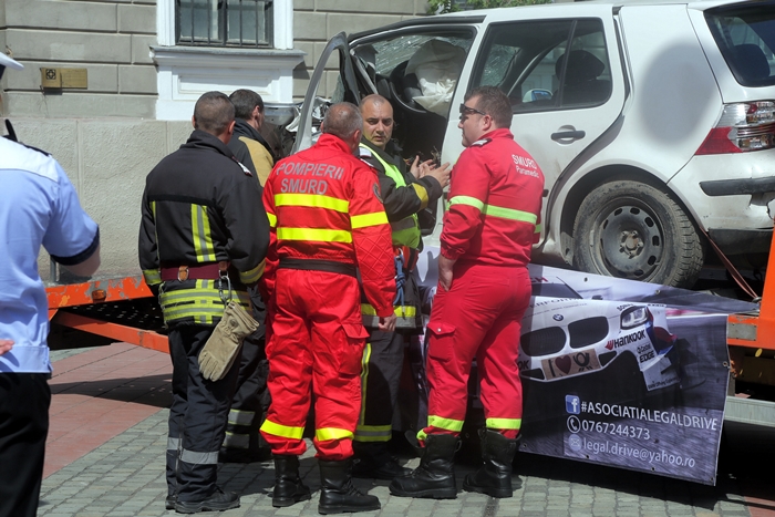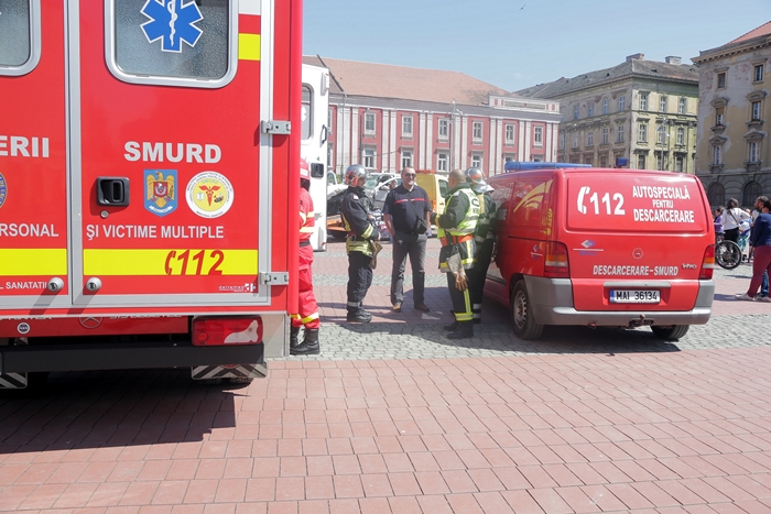La actiune au participat si echipaje ale ISU Banat, care au desfasurat si un exercitiu de descarcerare a victimei, careia i-au acordat si masuri de prim ajutor, sub privirile spectatorilor din piata publica.