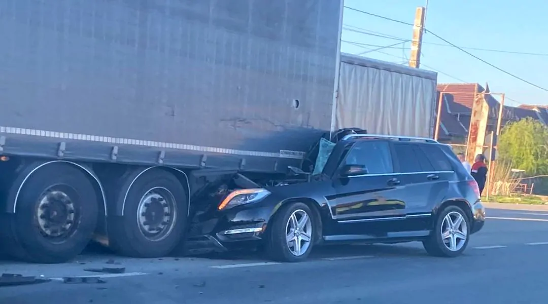 TIMIȘOARA. Accident lângă Timișoara, duminică seara. Un șofer de 20 de ani s-a înfipt cu mașina într-un TIR, la Remetea Mare.