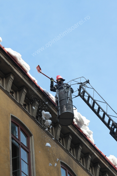 Militarii s-au ridicat la inaltime cu autoscara si s-au chinuit cu o lopata sa indeparteze cu grija stratul amenintator de zapada de pe strada Janos Bolyai, la doi pasi de Piata Libertatii.