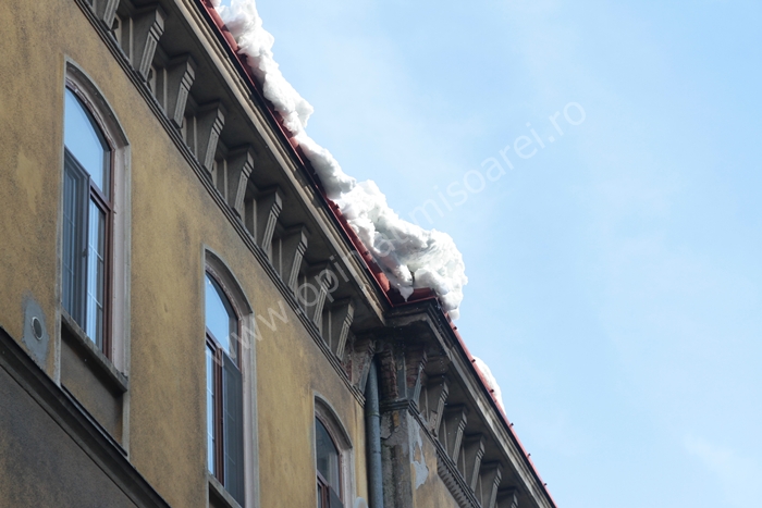 TIMISOARA. Atentie, cad bucati uriase de omat de pe acoperisuri in Timisoara! Incalzirea usoara a vremii din ultimele zile a facut ca stratul de zapada de pe imobilele din oras sa se fragmenteze, iar apoi sa alunece incet incet de pe stresini.