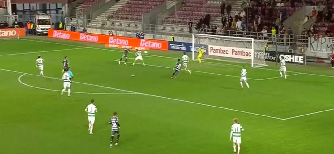 La faza imediat următoare, pe contraatac, balonmul a ajuns la Rareș Pop în partea stângă. Fotbalistul alb-vișiniilor a centrat perfect în careu, de unde Jambor a trimis cu capul în plasă pentru 0-1.