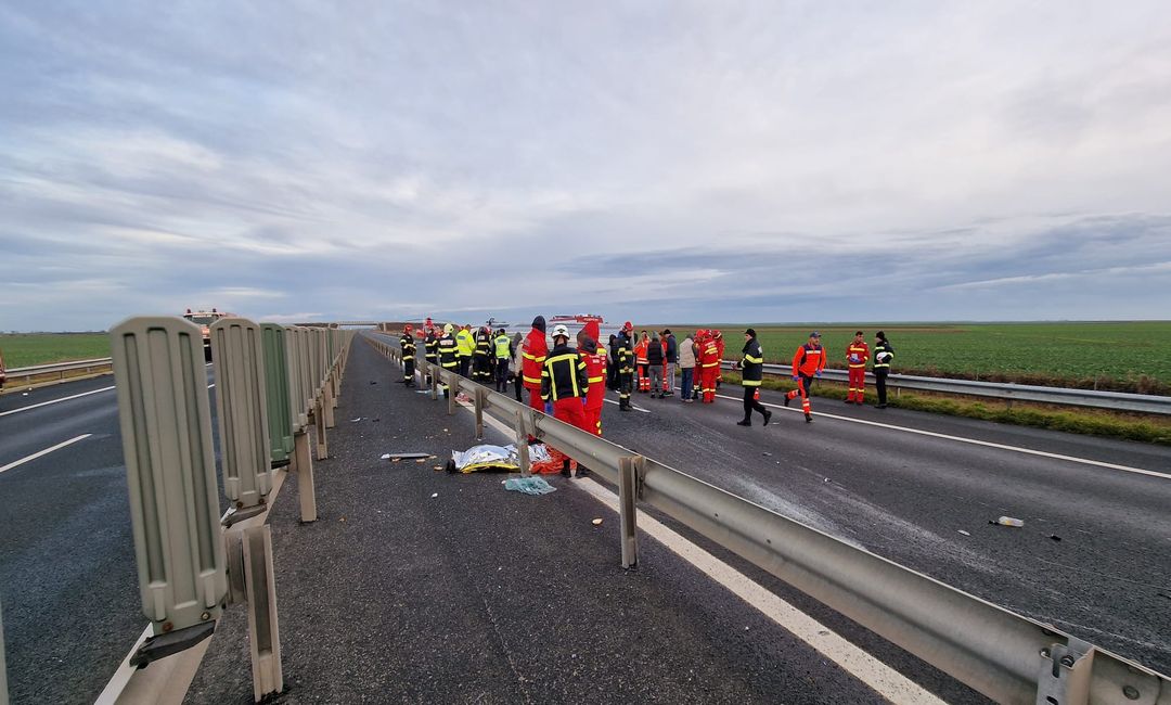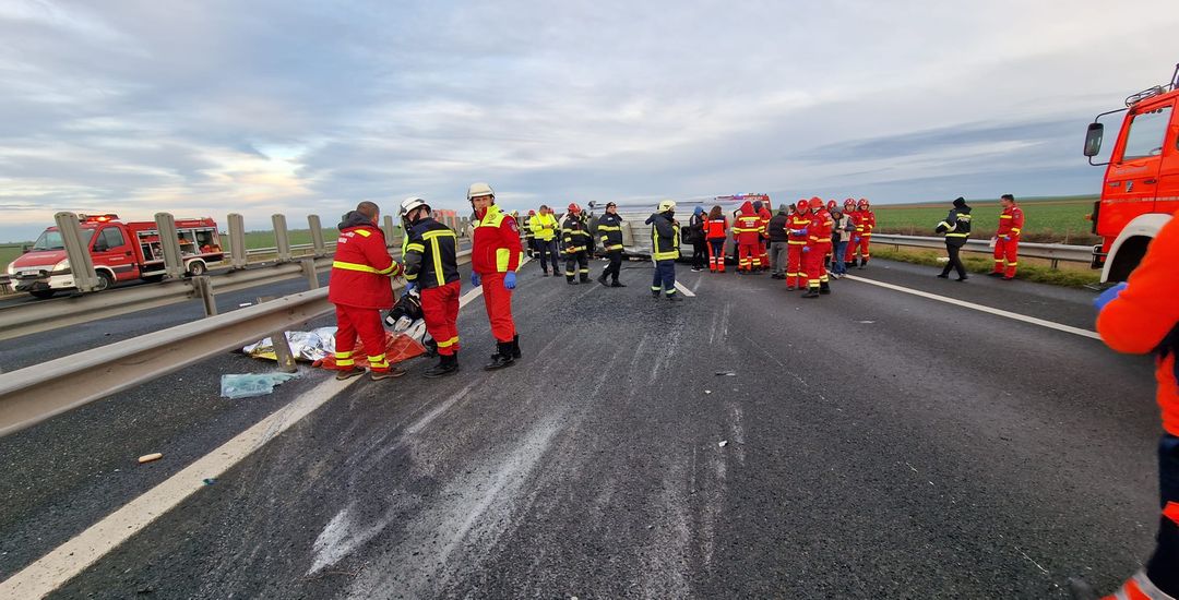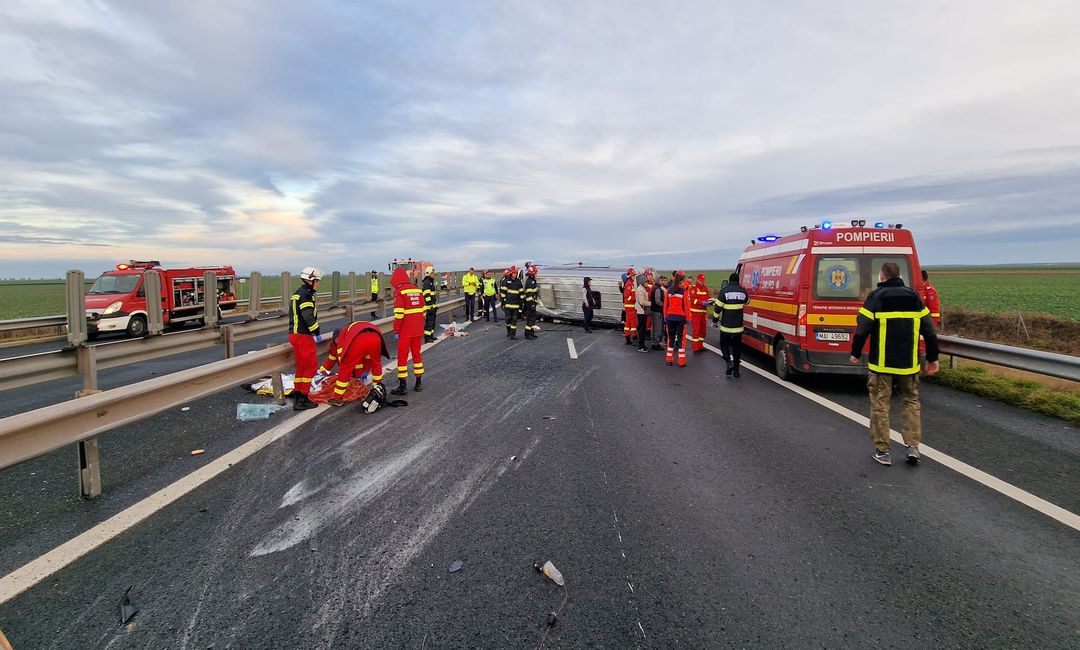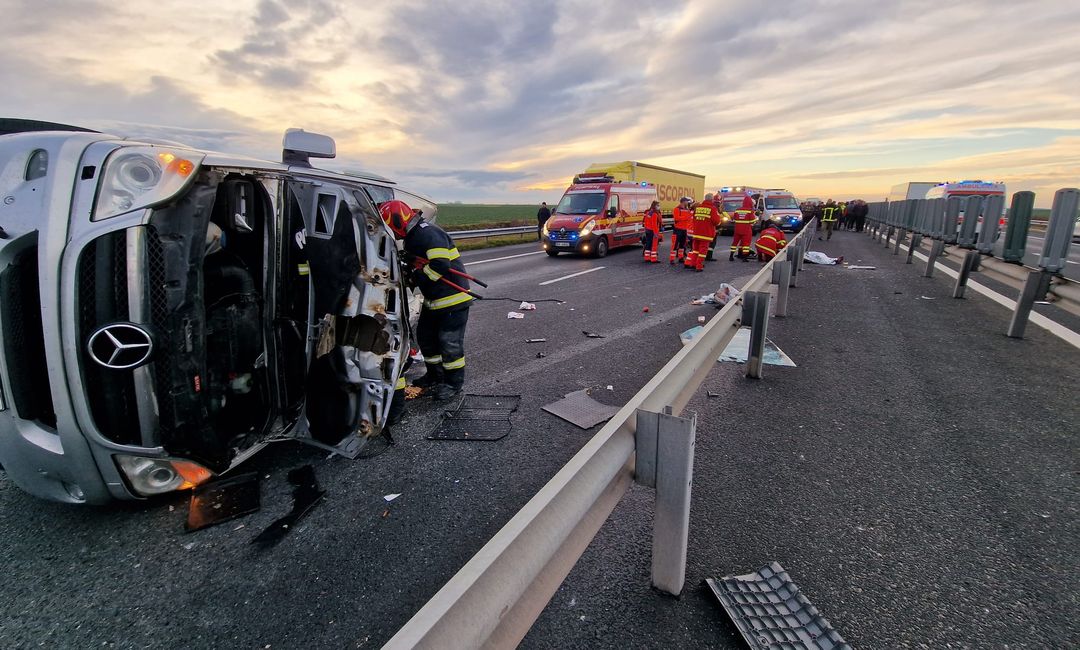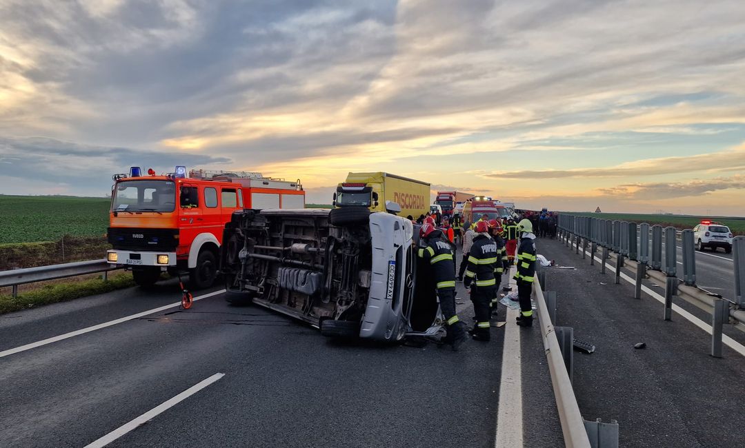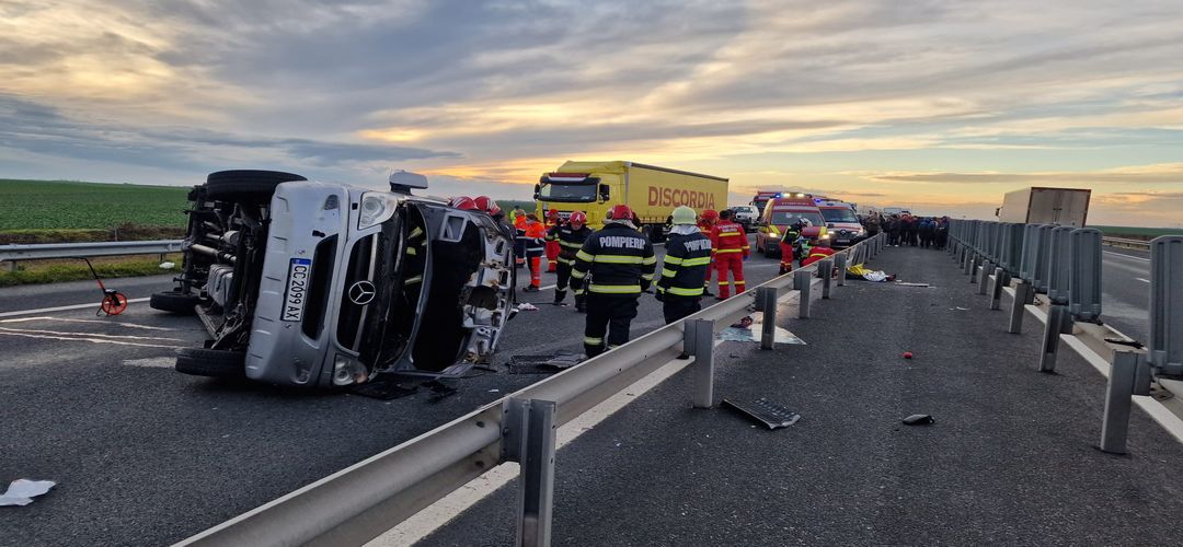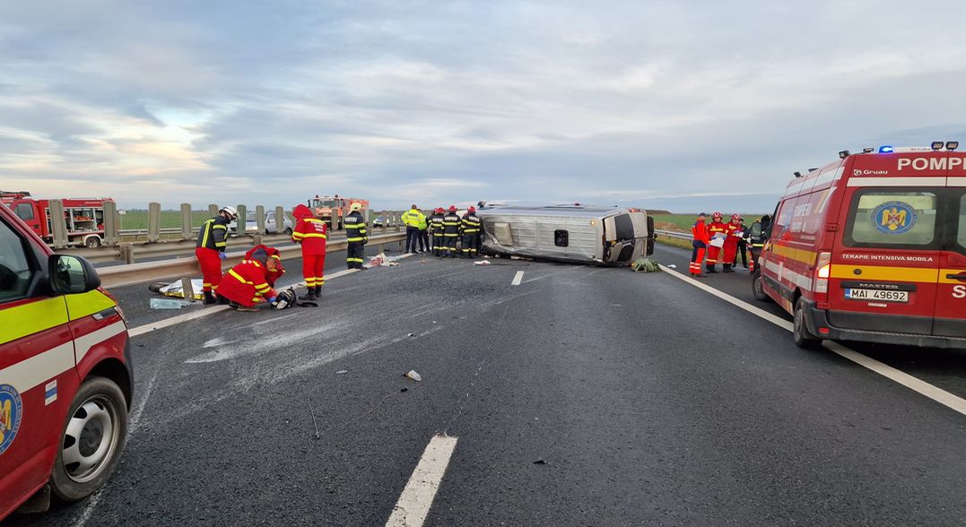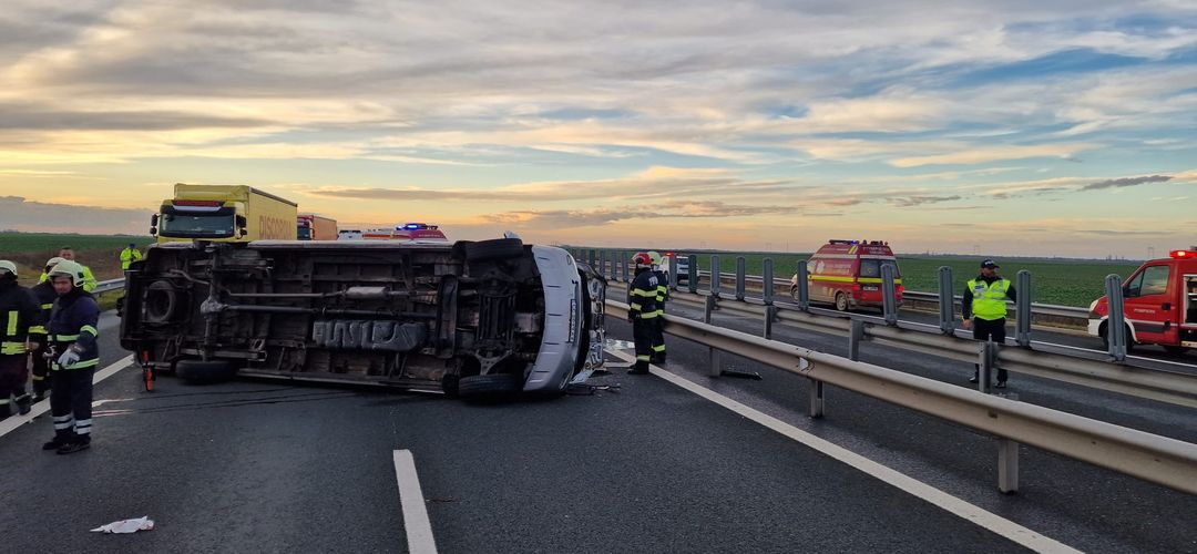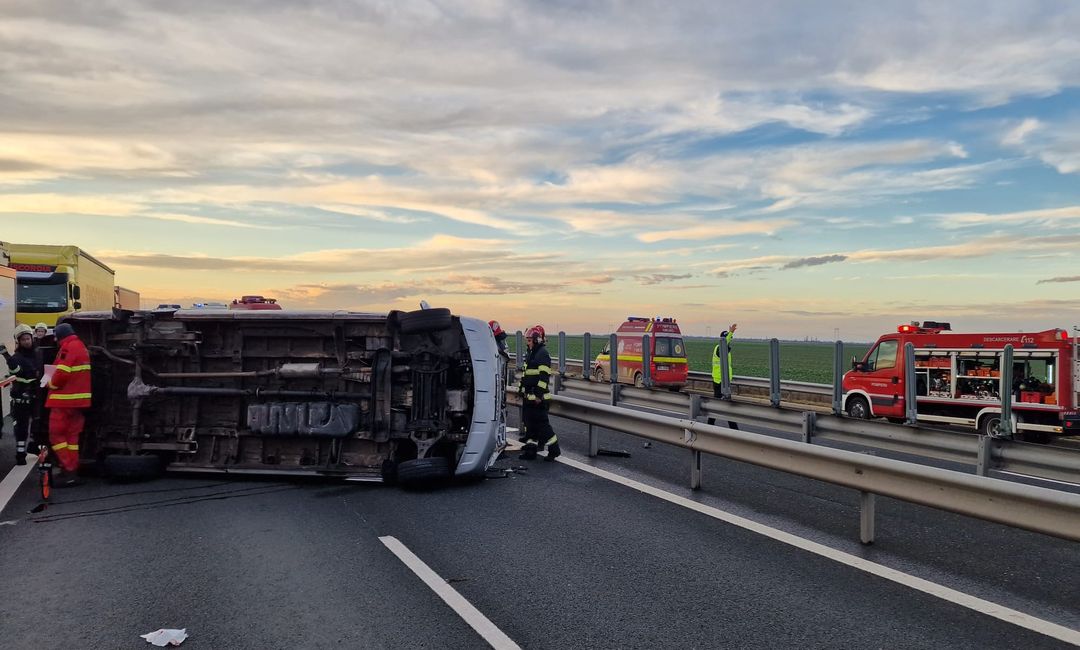 Grav accident de circulatie pe Autostrada Vestului, vineri dupa amiaza. Un microbuz cu 9 oameni la bord s-a rasturnat intre Nadlac si Arad.