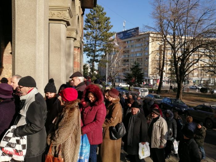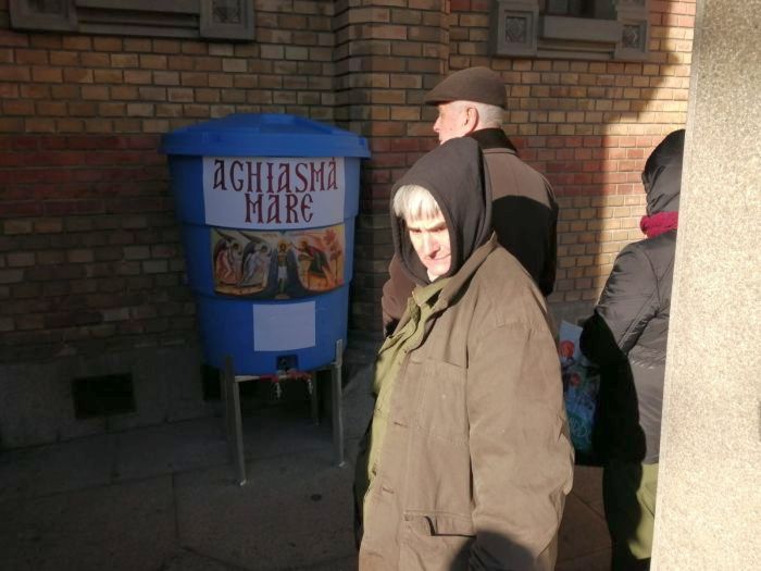 Oamenii s-au asezat la coada si pe doua randuri pentru a ajunge mai repede la agheasma. Acestia spun ca apa sfintita le aduce liniste in case si ii fereste de boli tot anul.
