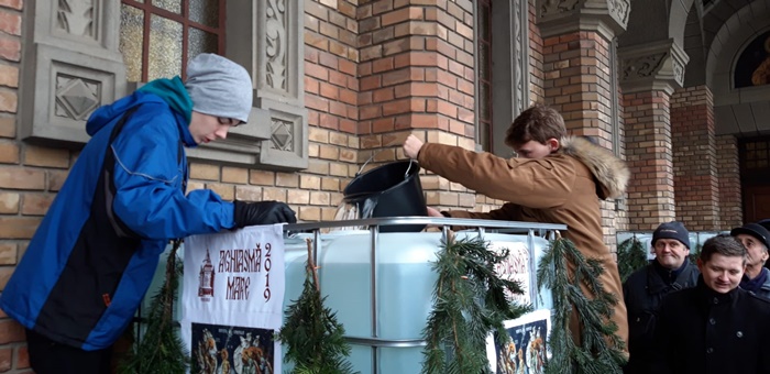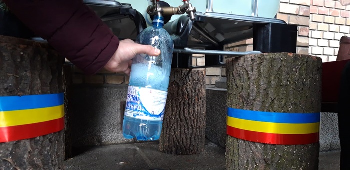 Apa sfintita a fost asezata in 4 butoaie mari de plastic, ce au fost asezate pe butuci de lemn decorati cu tricolor, in afara lacasului de cult, in partile laterale.