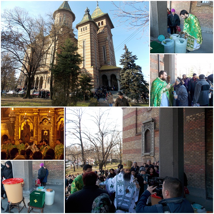 TIMISOARA. Cozi uriase la Catedrala Mitropolitana, ce s-au intins pe zeci de metri. Timisorenii au venit cu mic, cu mare sa primeasca agheasma de Boboteaza de la preotii care au sfintit apele.
