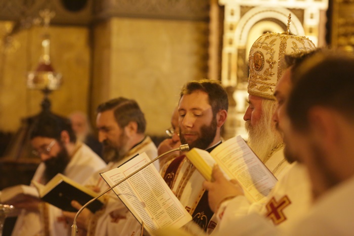 IPS Ioan Selejan primit buchete de flori din partea preotilor, in timp ce corul Catedralei i-a cantat La Multi Ani alaturi de credinciosi.