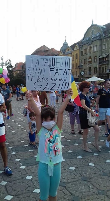 Multi dintre protestatari si-au adus copiii la miting intr-o veritabila lectie de democratie. Printre pitici, se remarca o fetita ce tine in mana un mesaj de sustinere pentru romanii din diaspora si bucurestenii care noaptea trecuta au fost victime ale violentei jandarmilor ce au intervenit cu brutalitate impotriva manifestantilor din Capitala.