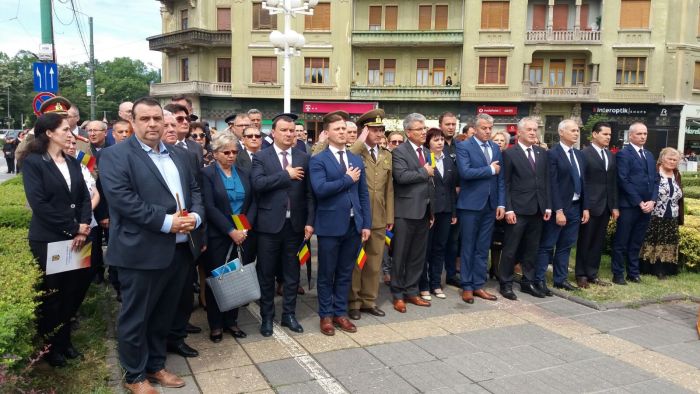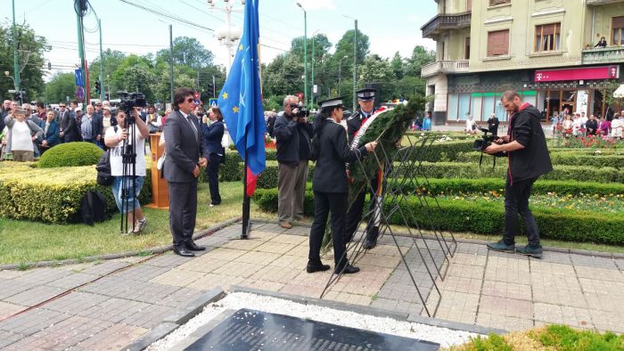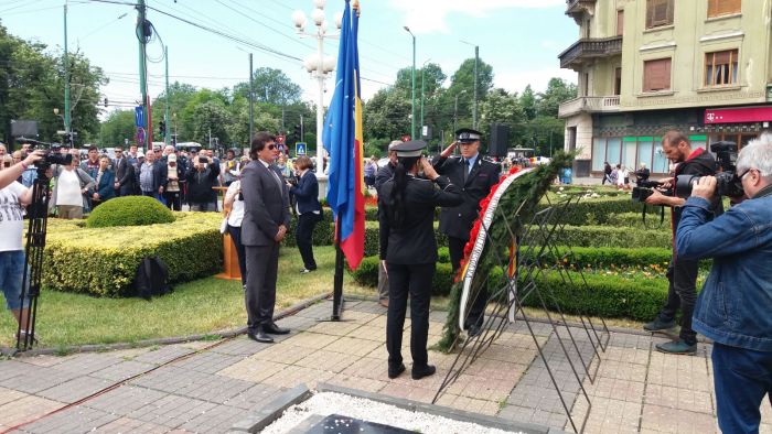 A urmat depunerea de coroane de flori din partea celor prezenti, pe ritmurile Imnului Eroilor, la monumenul din Piata Victoriei.