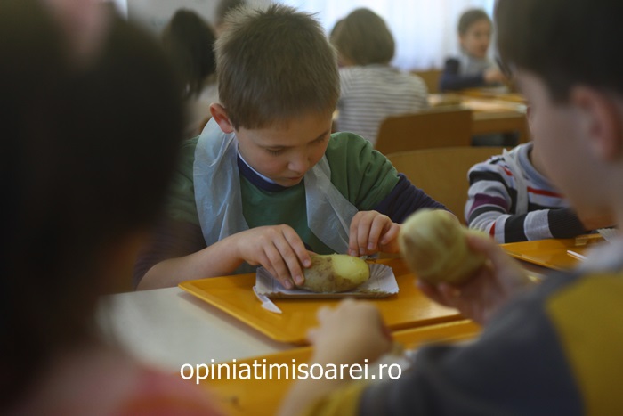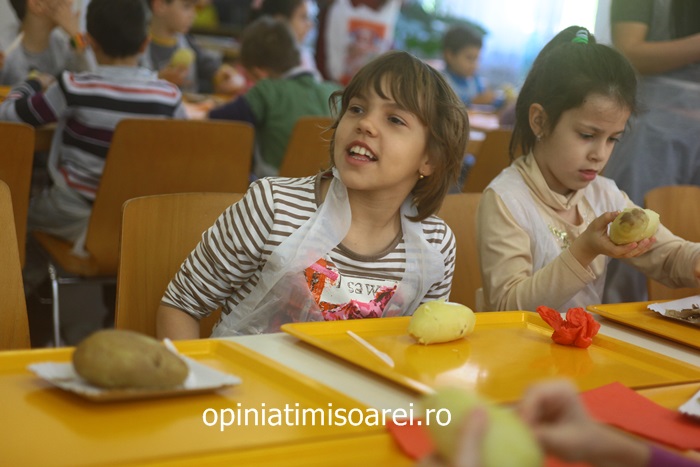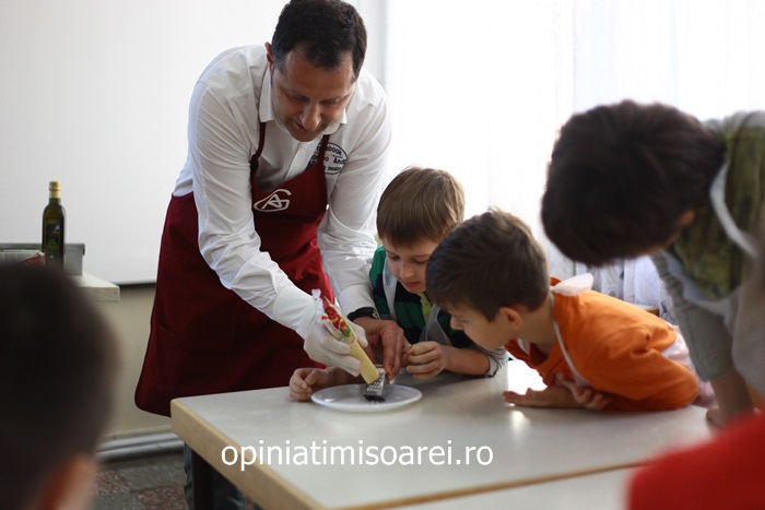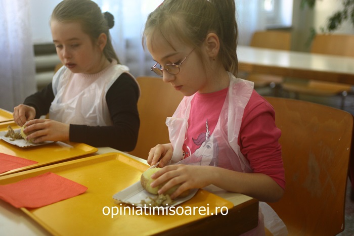 TIMISOARA. Educativ si sanatos! Prichindeii din clasa a II-a C ai Frau Astrid Gavriliu de la Scoala Nikolaus Lenau din Timisoara s-au distrat de minune joi dimineata, la cantina scolii. Micutii au facut ‘ravagii’ in bucatarie, sub atenta supraveghere a bucatarului Georgeo Andrei.