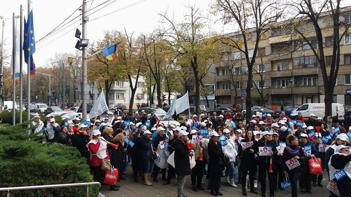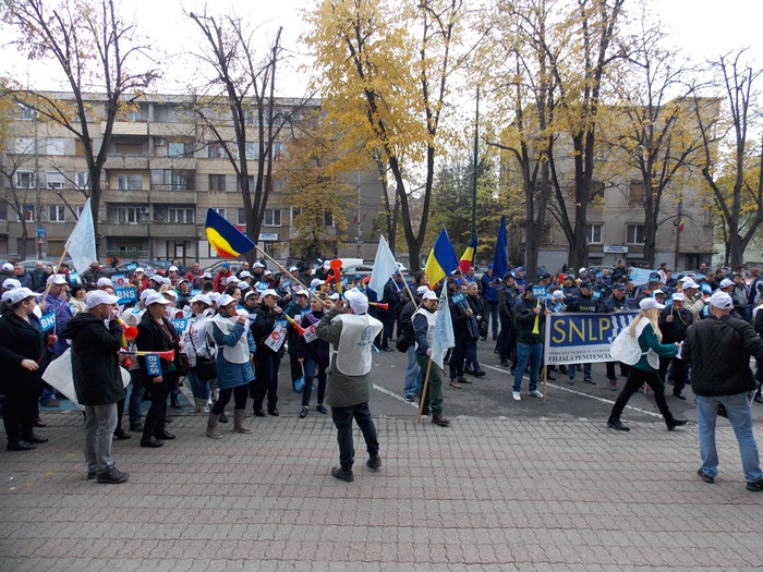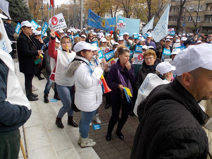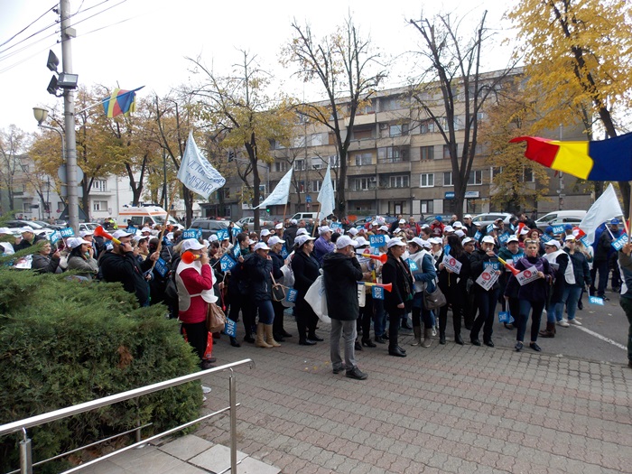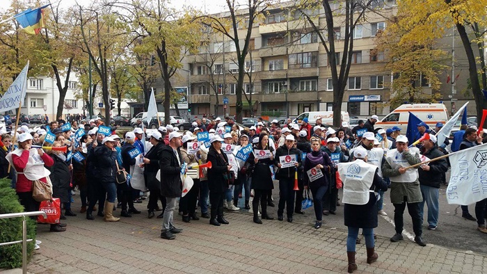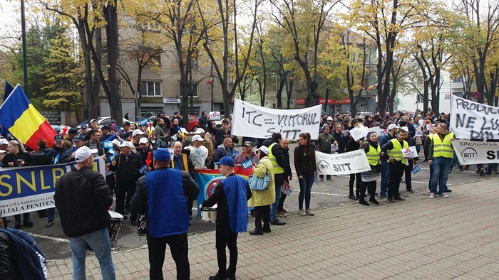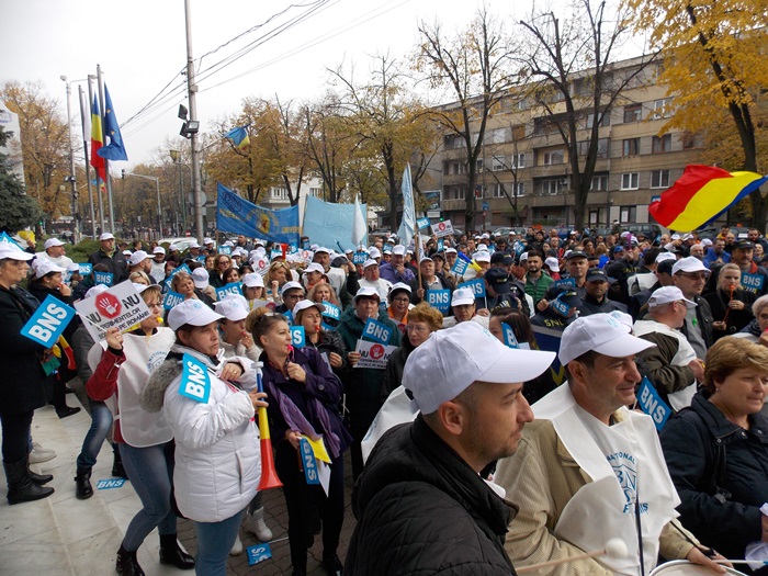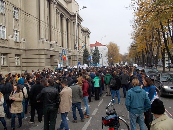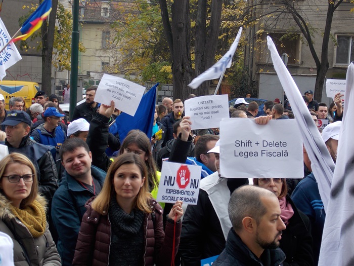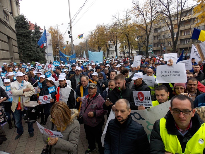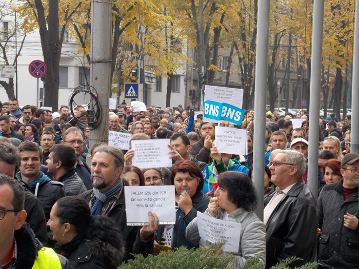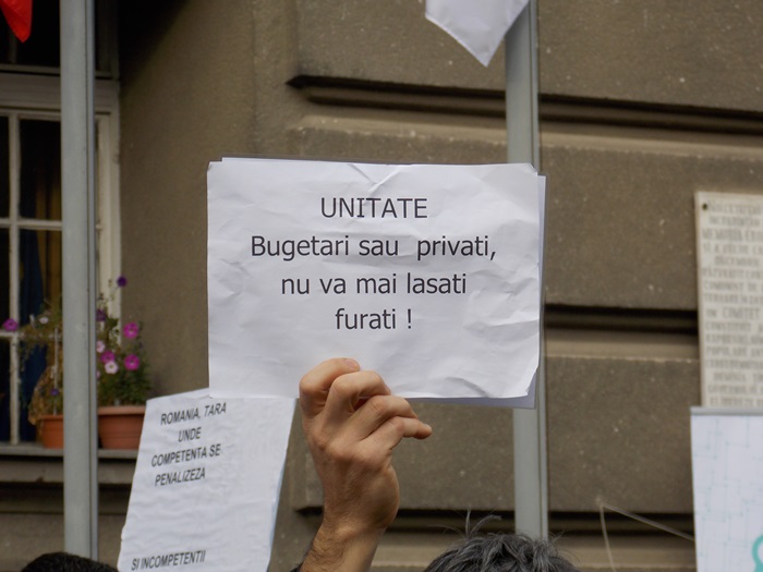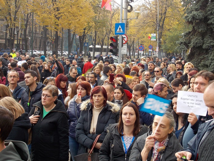 UPDATE: Protestului s-au alaturat si mai multi angajati ai firmelor private din domeniul IT, iar o delegatie condusa de presedintele la nivel national al BNS, Dumitru Costin, a fost primita de prefectul Eva Andreas pentru a-si prezenta nemultumirile.