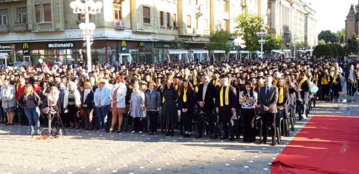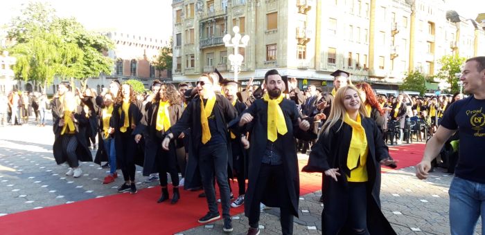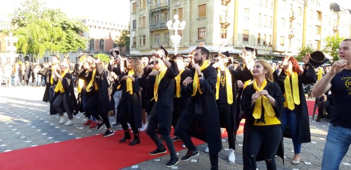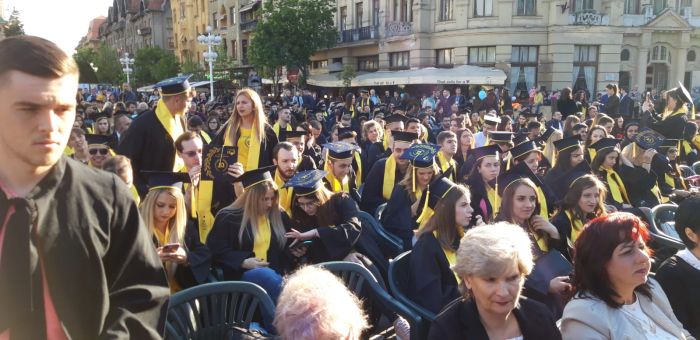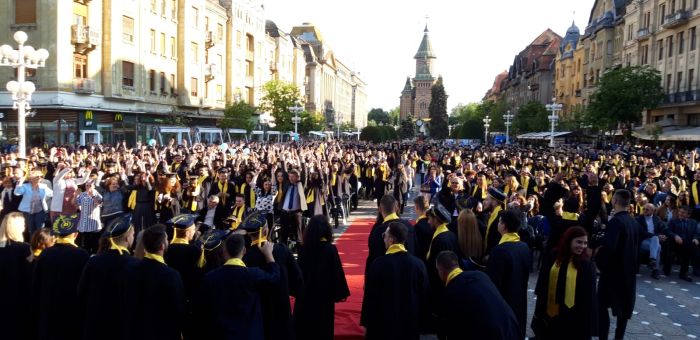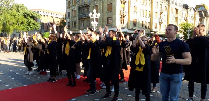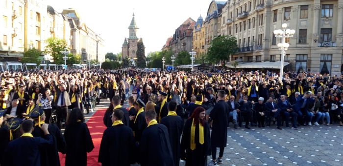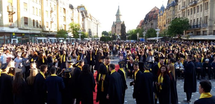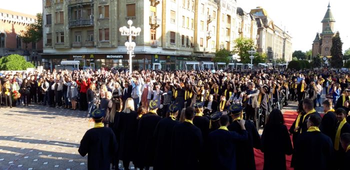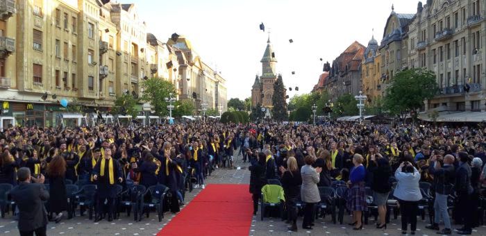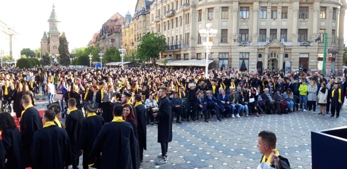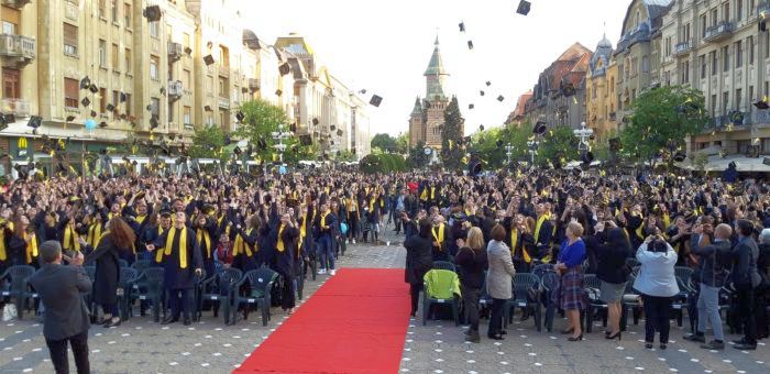 TIMISOARA. Si-au aruncat toca in aer si au spus adio profesorilor care le-au indrumat pasii spre profesia pe care o vor imbratisa in scurta vreme. Sute de absolventi de la Universitatea de Vest si-au tinut gala de incheiere a studiilor, in premiera, in Piata Victoriei.