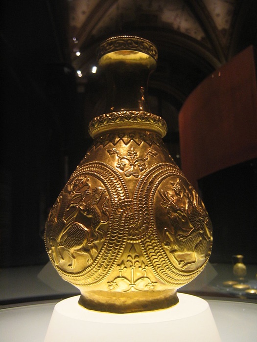E posibil sa fi fost vorba de un tribut platit de Bizant unui print barbar de la Dunare, prin care se cumparau linistea si securitatea in zona. Unele vase au inscriptii grecesti cu mesaj crestin, altele au reprezentari de inspiratie persana, altele trimit spre zona central-asiatica, iar altele sunt greco-romane. Ce da o mare valoare tezaurului este insa lucratura mesterilor aurari care este aproape de perfectiune. Studiile facute de catre cercetatorii austrieci, care au efectuat o scanare microscopica asupra pieselor, marind detaliile de 4000 de ori, au aratat ca exista ornamente de doar un milimetru, pentru care s-a lucrat cu trei instrumente diferite.