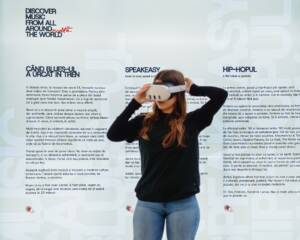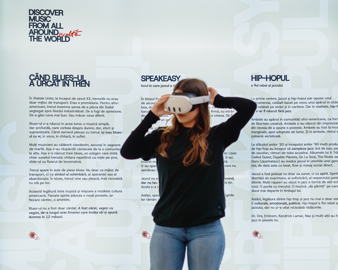 Expoziția prezintă și o parte tehnică. Avem o mediatecă unde pot fi ascultate viniluri la pick-up, avem instalații VR care spun două povești muzicale frumoase, anume povestea lui Louis Armstrong și povestea Buena Vista Social Club și, nu în ultimul rând, avem instrumente de pian și tobe însoțite de aplicații și tutoriale, astfel încât toți doritorii pot să vadă ce înseamnă să fii muzician.