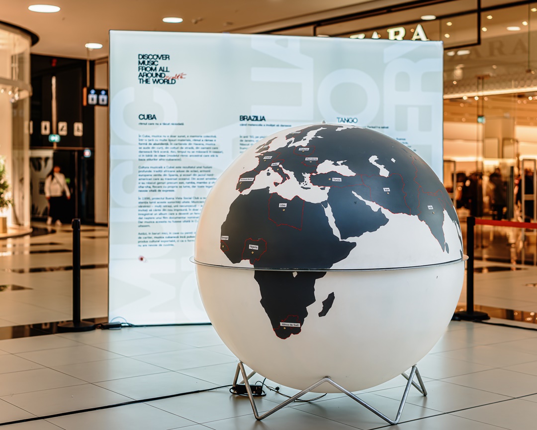 Tema de anul acesta, “Music Around the World”, ne plimbă prin 25 de țări, fiecare cu sunetul ei distinct. Avem o instalație principală, un glob pământesc unde vizitatorii pot conecta căști și asculta muzică autentică din diferite regiuni. Practic, e o călătorie sonoră prin culturile lumii, fără pașaport.
