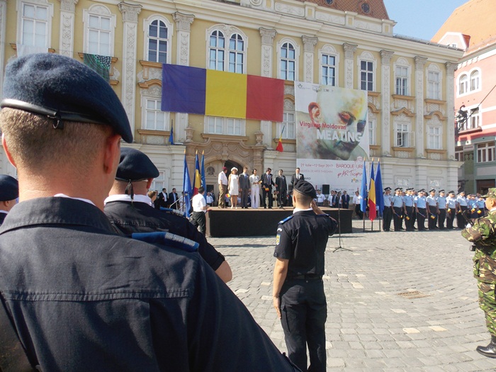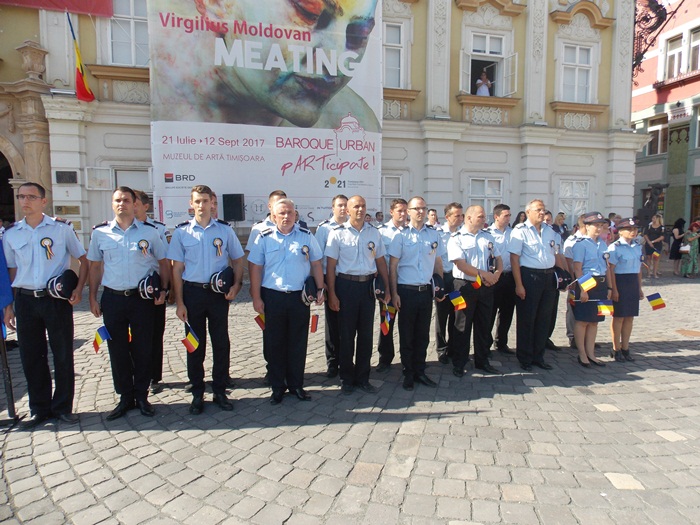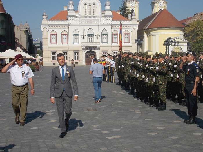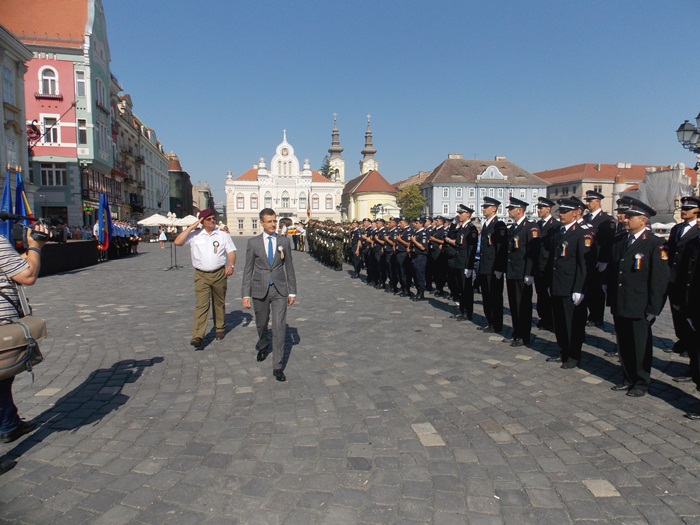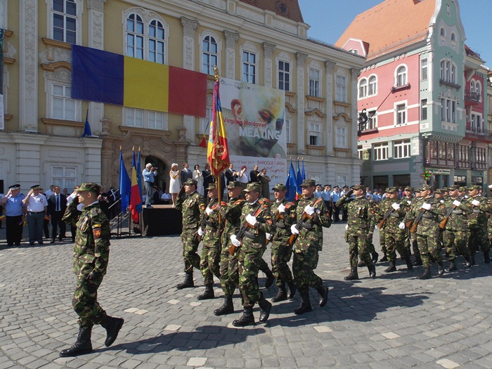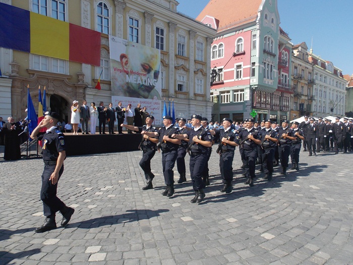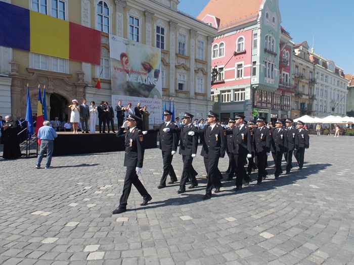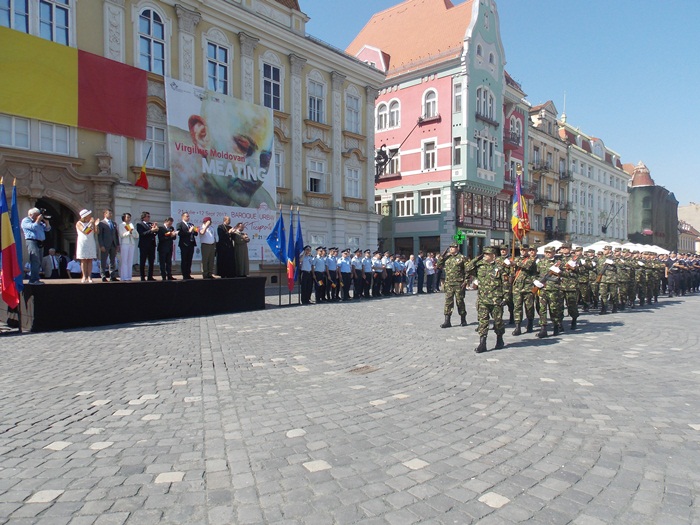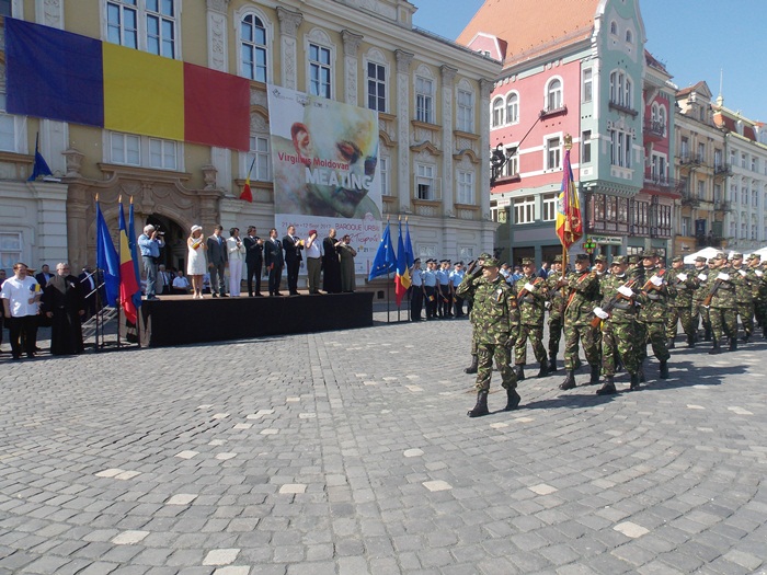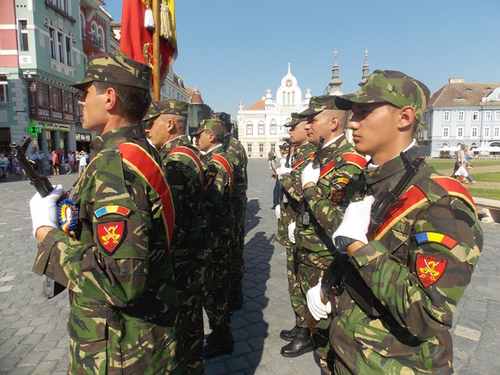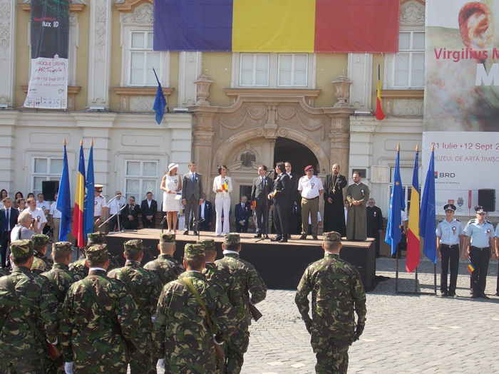 La festivitati au participat oficialitati locale si judetene, parlamentari de Timis si europarlamentari, dar si trei preoti care au oficiat o slujba inaintea defilarii trupelor.
