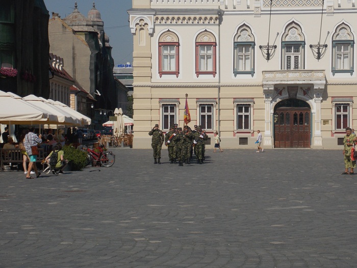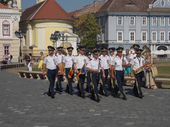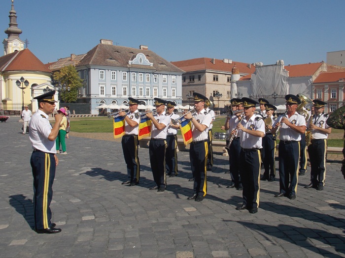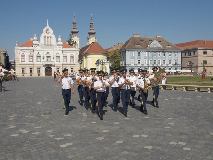 TIMISOARA. Piata Unirii a gazduit de Ziua Timisoarei o scurta parada militara pe muzica de fanfara, care i-a incantat pe timisoreni.