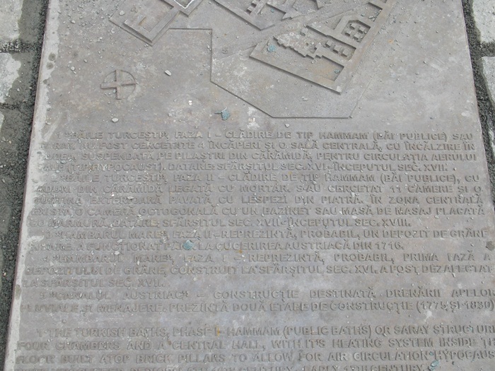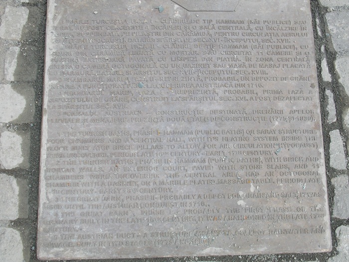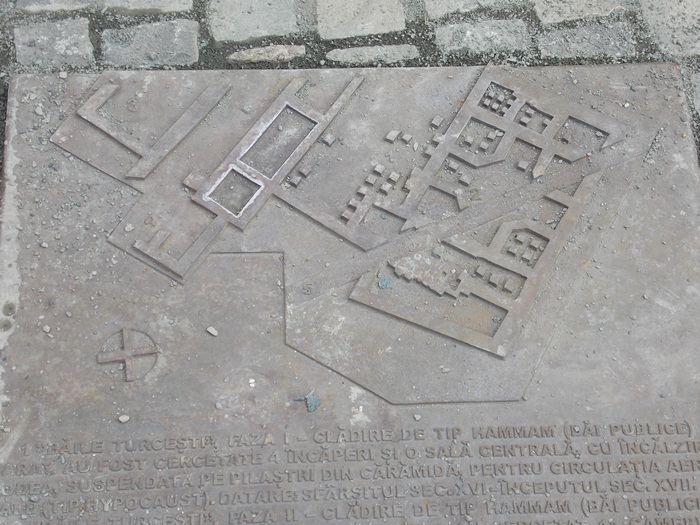 Baile turcesti gasite in piata Libertatii, care dateaza de la sfarsitul secolului al XVI-lea si inceputul celui de-al XVII-lea, sunt prezentate in detaliu pe placheta metalica. Conform prezentarii scrise sub desen, in zona centrala a bailor, se afla “o camera octogonala, cu un bazinet sau o masa de masaj, placata cu marmura, care dateaza de la sfarsitul secolului XVII-inceputul secolului al XVIII-lea“.