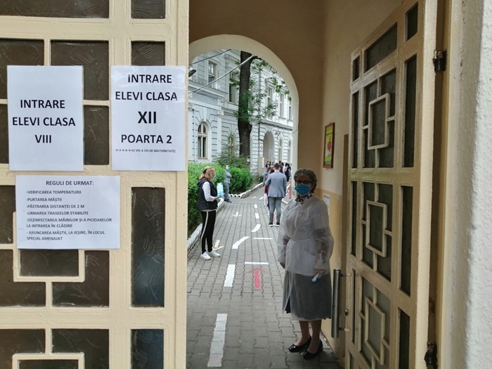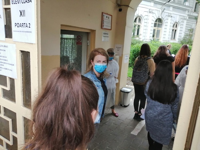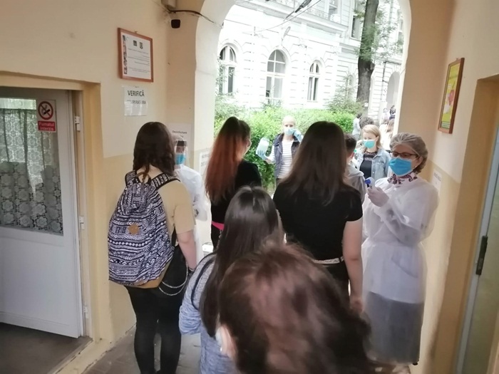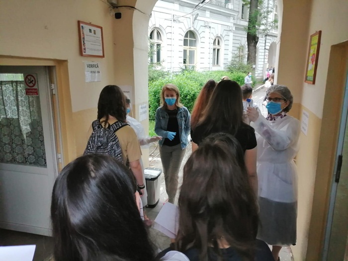 Inainte de a intra in sali, elevilor li s-a masurat temperatura. Apoi, daca termometrul a aratat mai putin de 37,3 grade, insotiti de un cadru didactic s-au putut indrepta spre sala de examen unde locurile au fost gandite astfel incat sa fie doar cate 10 elevi, intre care sa existe cel putin 2 metri distanta.