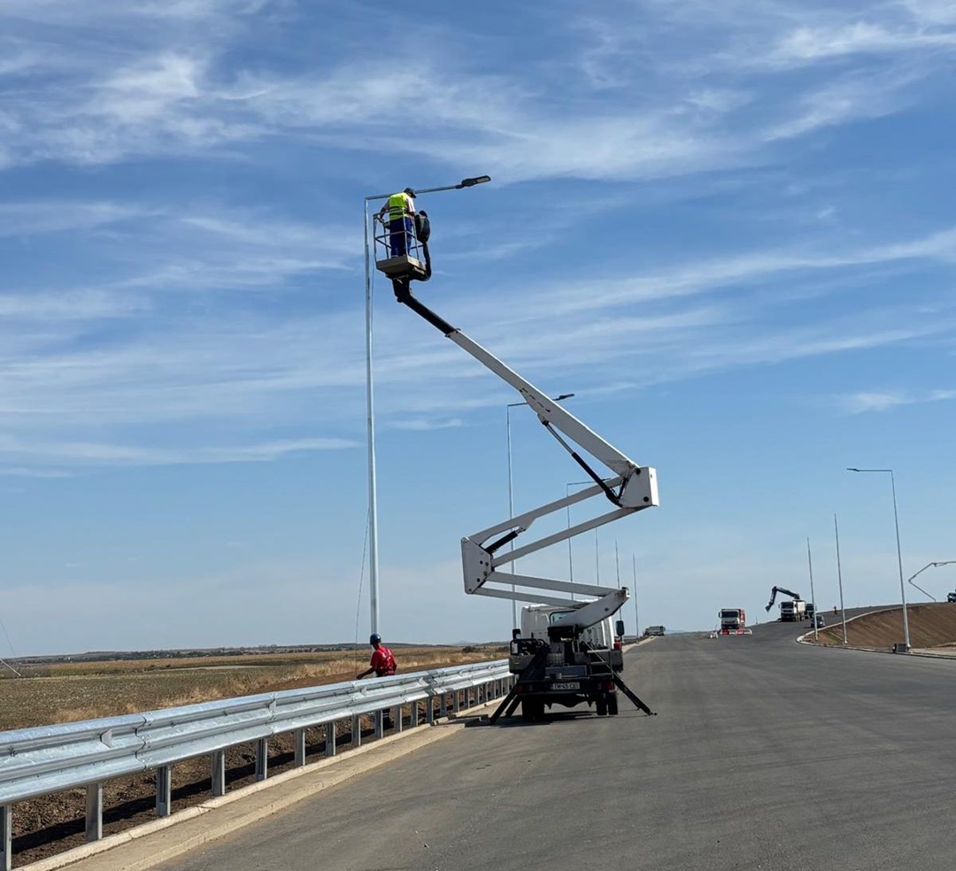 🛣️ Se execută rigolele, se profilează taluzul și se așterne stratul vegetal, se montează bordurile prefabricate și pavelele autoblocante la sensurile giratorii de la conexiunea cu DC 58 (spre Cerneteaz) și pe DN 69 Timișoara – Arad. De asemenea, se realizează rețeaua de iluminat rutier, se montează stâlpii și lămpile de iluminat“, transmit reprezentantii DRDP Timisoara.