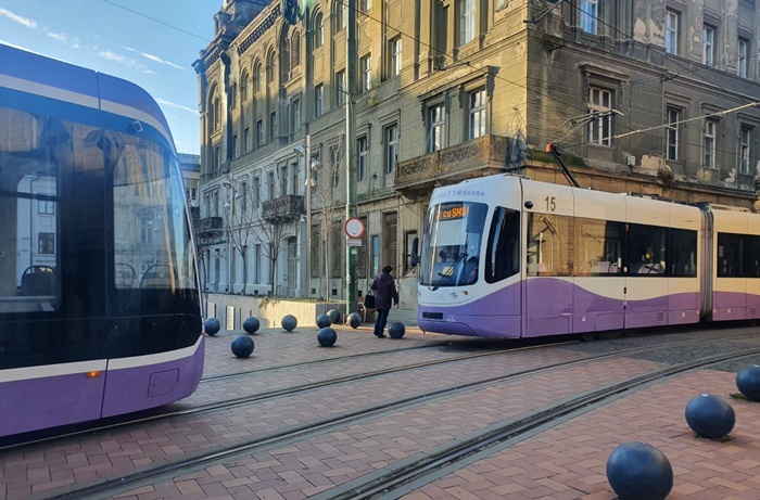 TIMISOARA. Tramvaie blocate in plin centru la Timisoara, dupa ce noul Bozankaya s-a intepenit pe linie in Piata Sfantul Gheorghe.