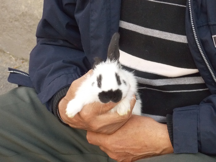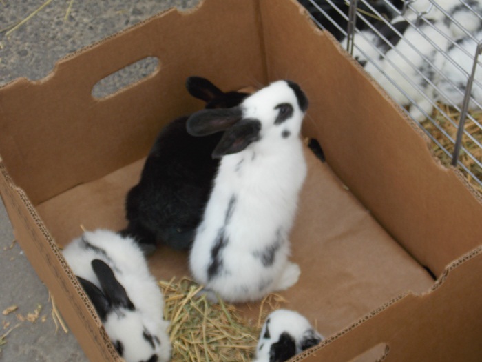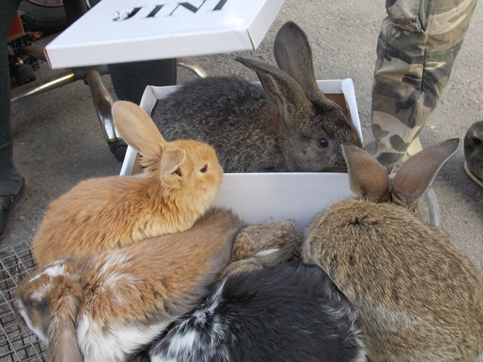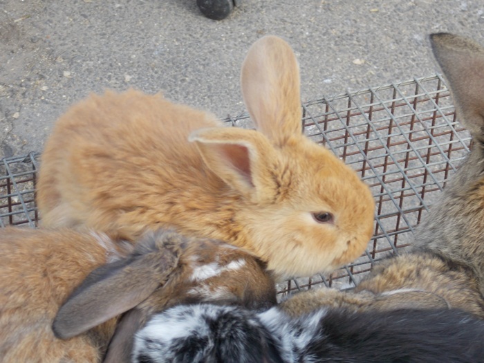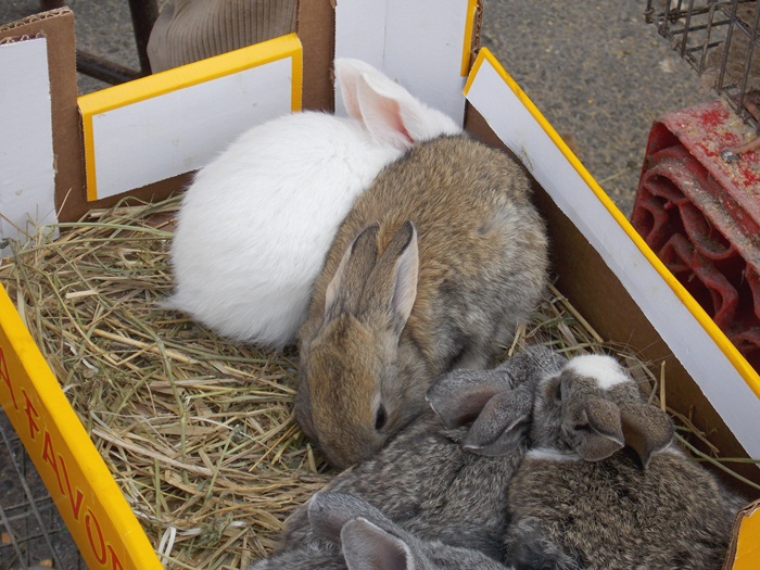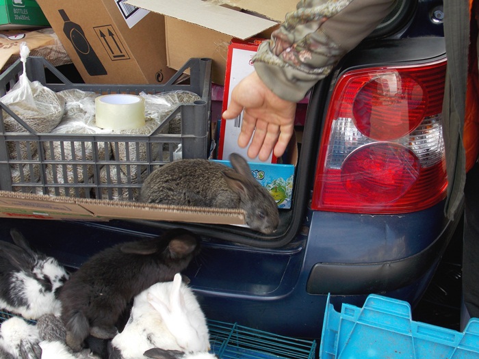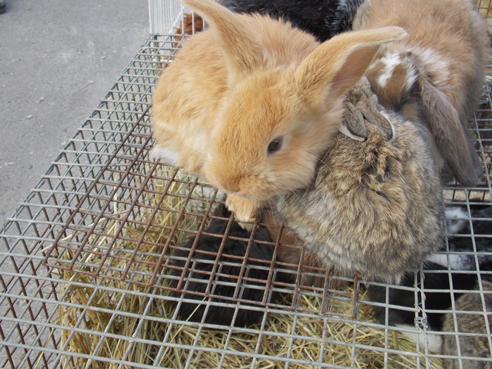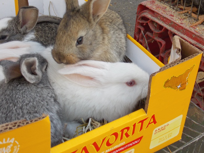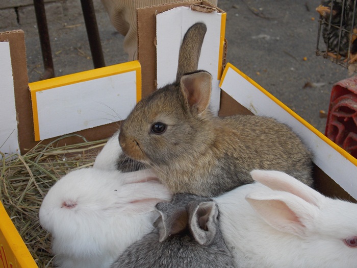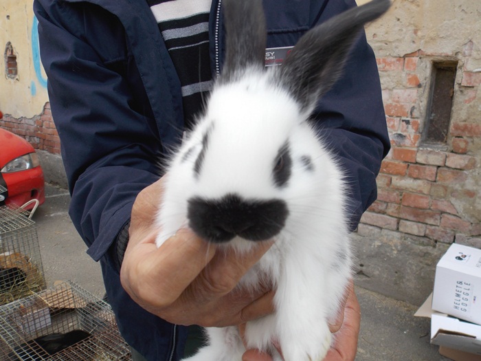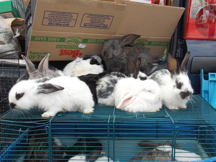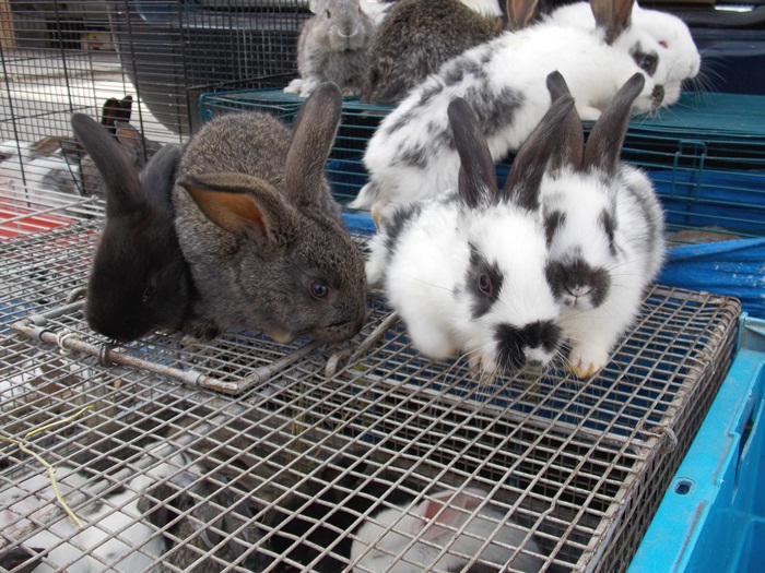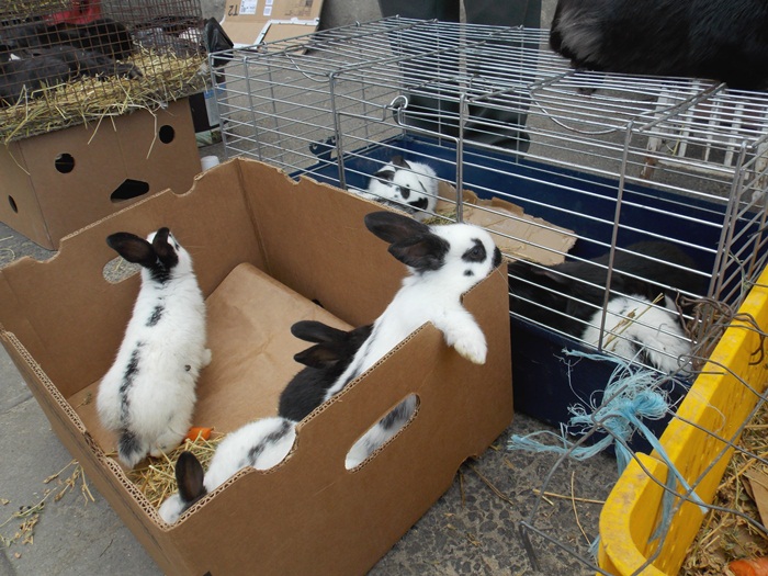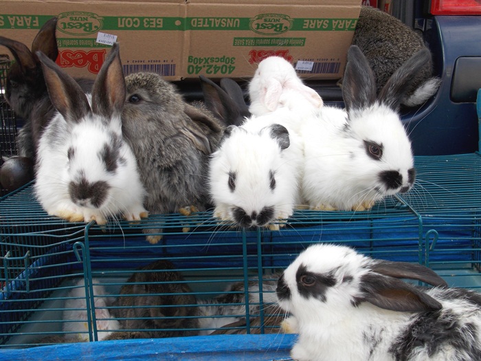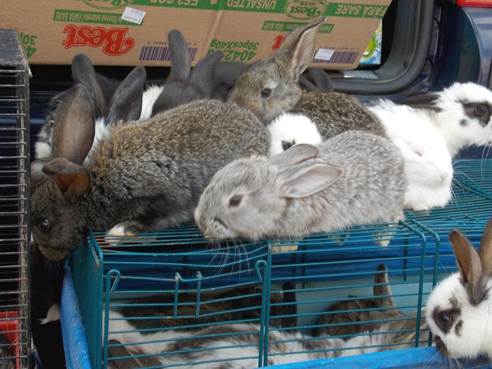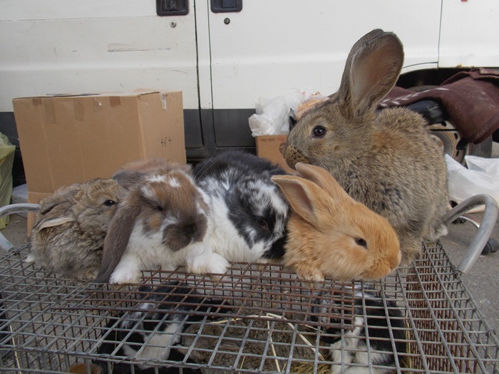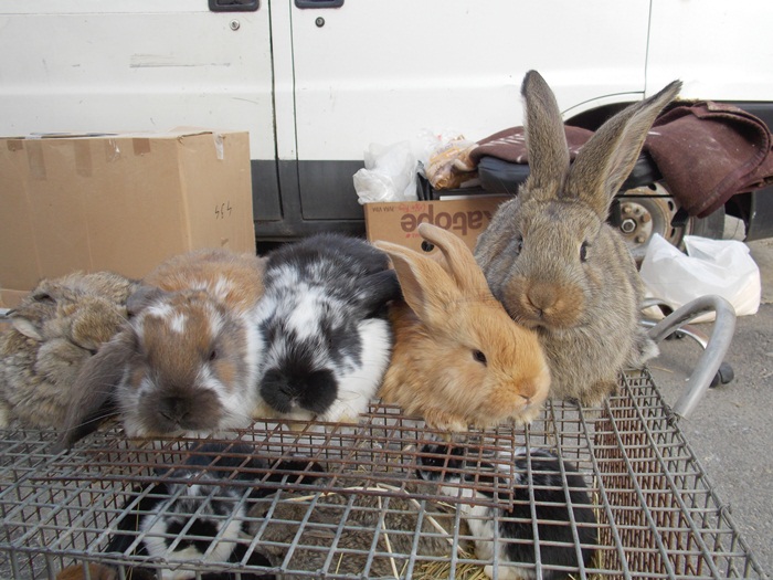 Iepuri pitici, marele alb, iepuri californieni sau asa numitul ‘cap de leu’ sunt printre speciile prezente in custile din piata de animale.