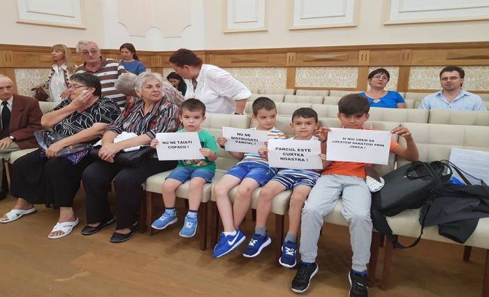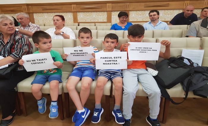 TIMISOARA. Mai multi copii, inarmati cu foi pe care au scris mesaje, au fost prezenti joi la dezbaterea de la Primaria Timisoara, destinata unui proiect privind construirea unui bloc in zona Kiriac, acolo unde in prezent este un parc.