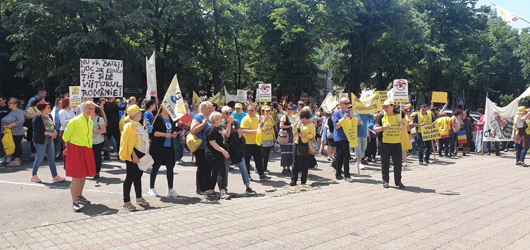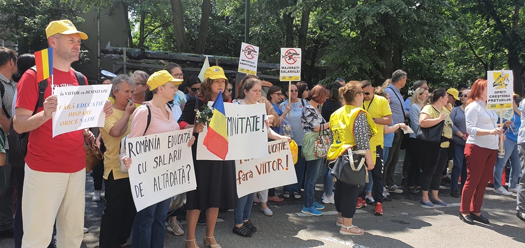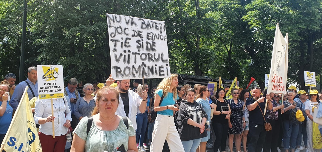 Acestia sunt inarmati cu vuvuzele si pancarte pe care au scris mai multe mesaje pentru guvernanti: “Nu va bateti joc de educatie si de viitorul Romaniei!”, “Vrem salarii decente“, “Impozitati profiturile!“, “Majorati salariile!“, “Iohannis, Romania Needucata“, “Nu 6% din PIB Educatiei, ma-Ciuca Invatamantului!“.