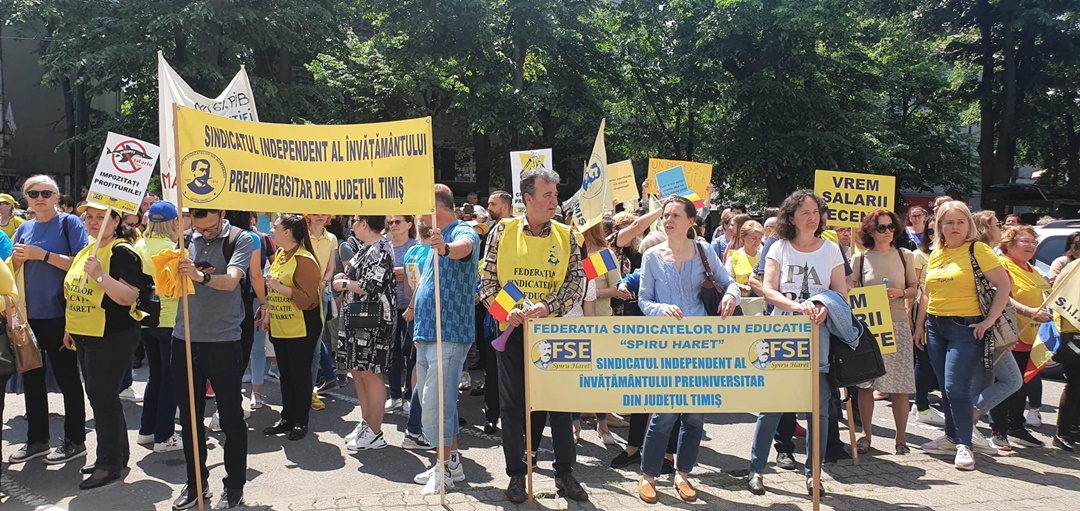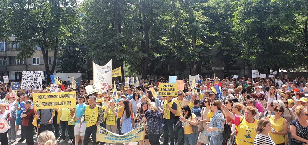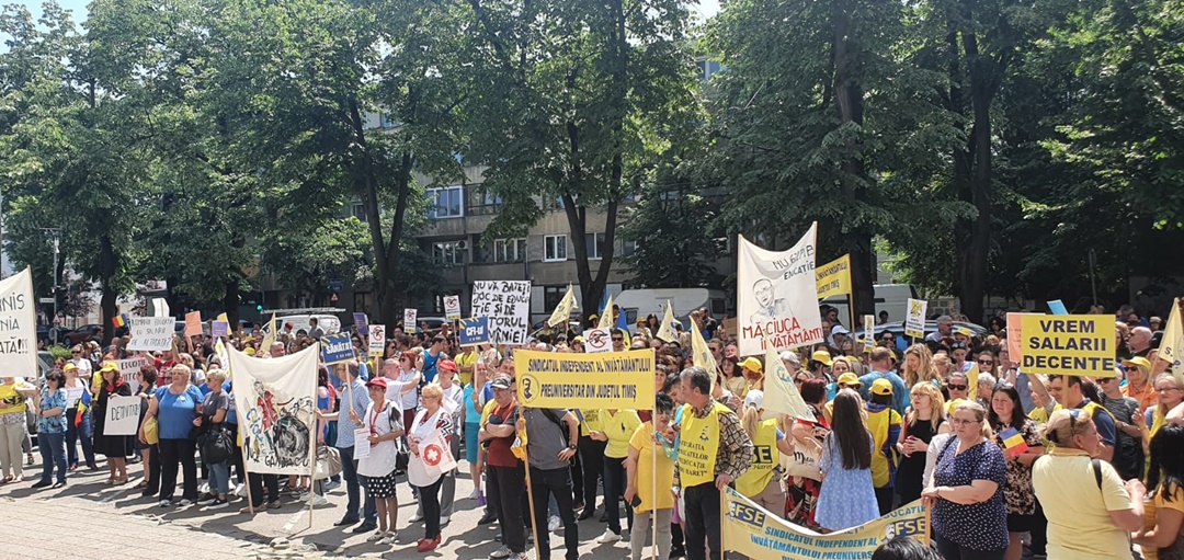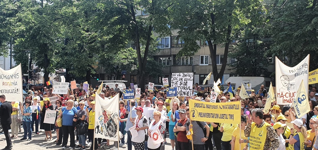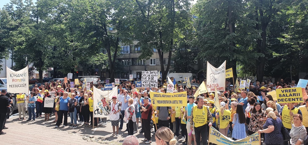 TIMISOARA. Actiune de protest in strada a profesorilor la Timisoara. In plina greva generala in invatamant, aproape 400 de dascali s-au adunat vineri in fata Prefecturii Timis pentru a-si striga nemultumirile.