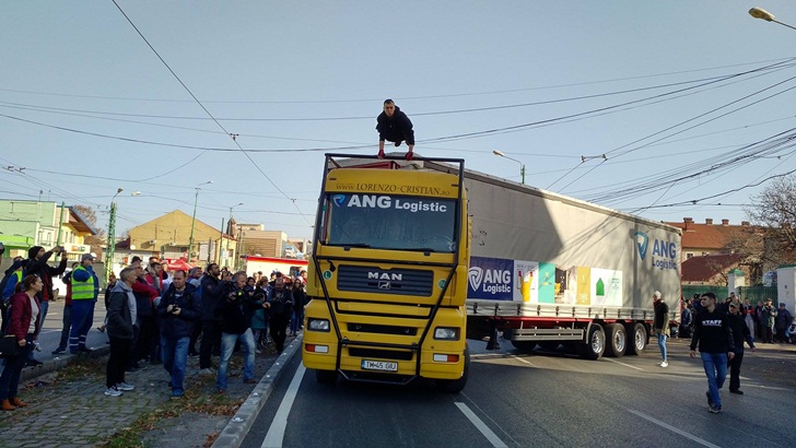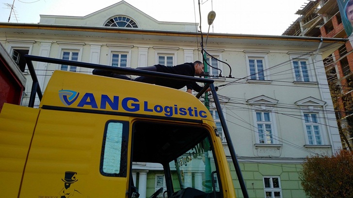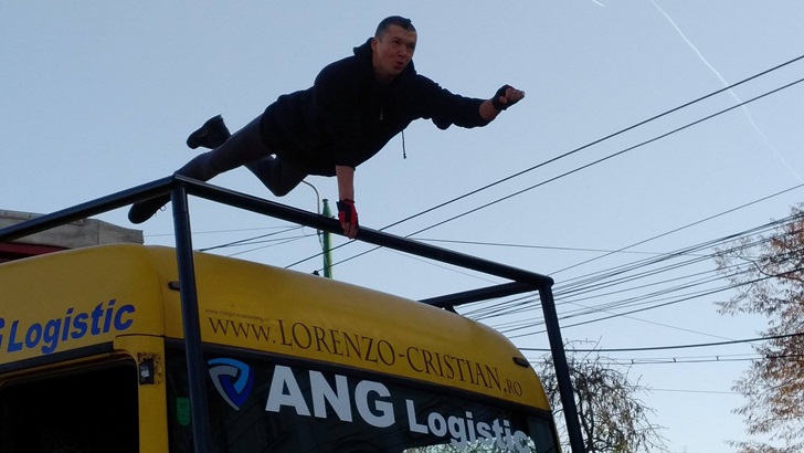Autocamionul peste care s-a ridicat magicianul are aproximativ 4 metri inaltime, 17 lungime, o greutate de 13 tone si apartine unei firme de transport.