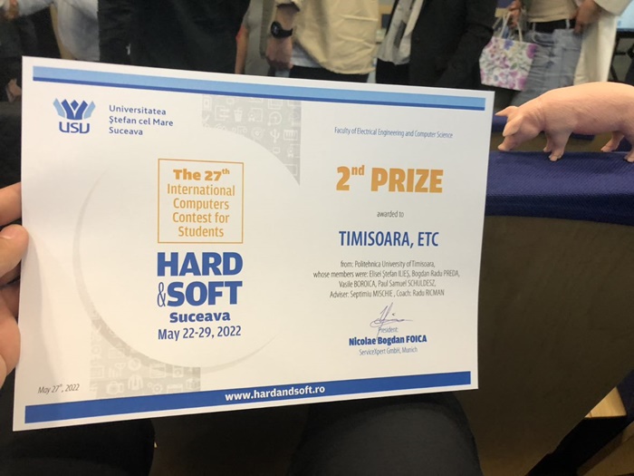 TIMISOARA. Universitatea Politehnica Timișoara a participat recent cu două echipe la tradiționalul concurs internațional studențesc Hard & Soft 2022, competiție ajunsă la cea de-a XXVII-a ediție, organizată anul acesta de Universitatea Ștefan cel Mare din Suceava. La eveniment au participat două echipe de studenți, una de la Facultatea de Electronică, Telecomunicații și Tehnologii Informaționale și una de la Facultatea de Automatică și Calculatoare.