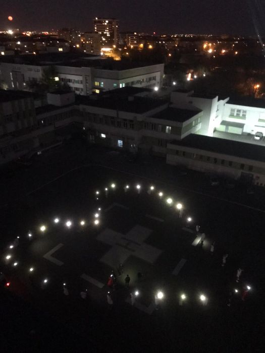 Pastrand 1 metru si jumatate distanta intre ei, angajatii de la Judetean au format o inima uriasa pe care au luminat-o cu lanternele telefoanelor mobile.