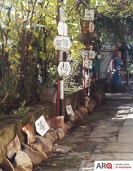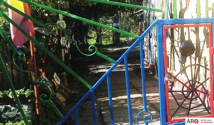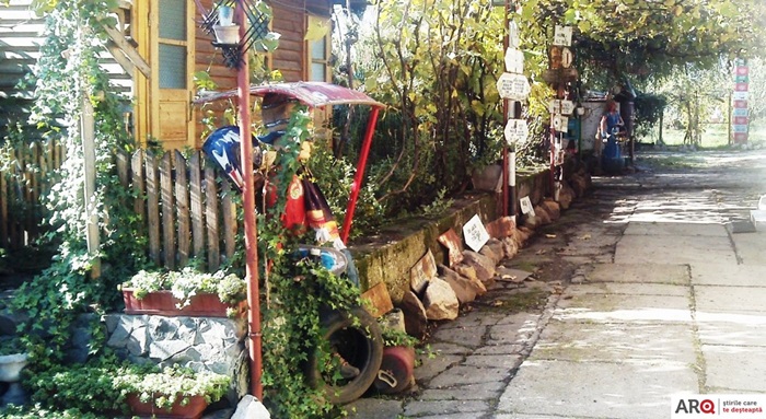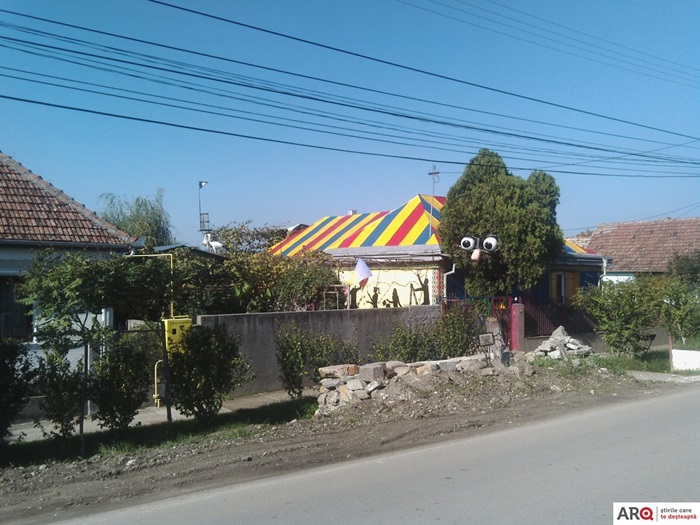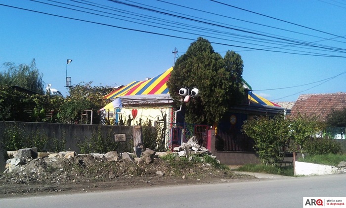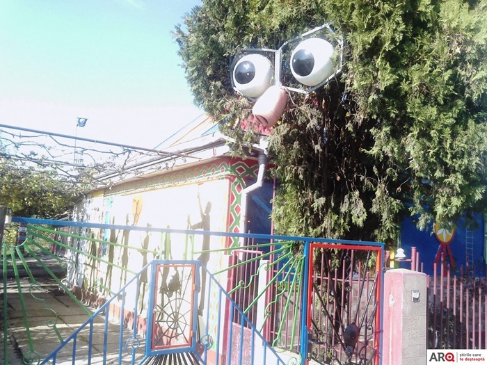 Unul dintre peretii casei este pictat cu personaje desprinse parca de pe platourile de filmare, iar manechini care intruchipeaza personaje de poveste sunt asezati in toata curtea. Nici steagurile tricolore nu lipsesc din batatura aradeanului, iar pe stalpii si bolovanii din curte sunt asezate placute cu informatii, indicand directii pentru vizitatori. Iar acoperisul pictat in culorile drapelului national le indica vizitatorilor ca proprietarii locuintei sunt mari iubitori ai tarii.