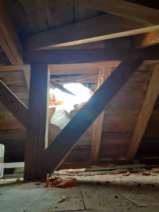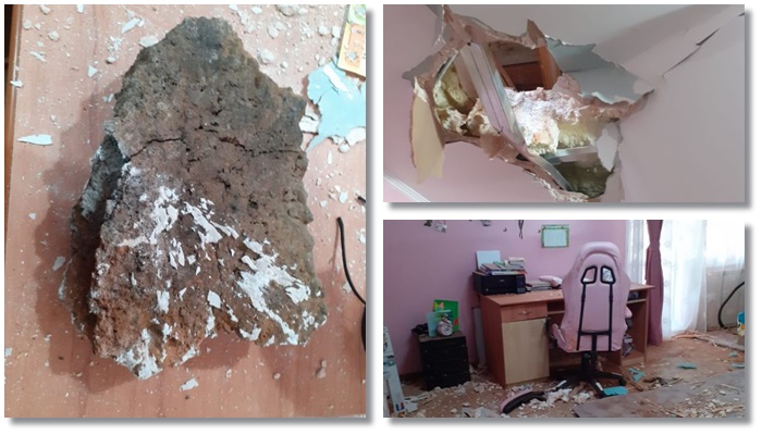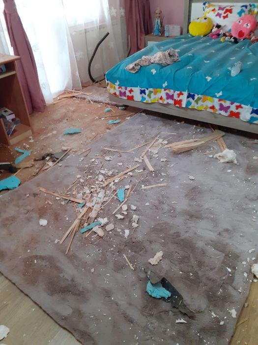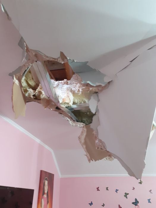 Bolovanul a strapuns acoperisul si plafonul locuintei si a cazut in camera unei fetite, distrugand chiar scaunul de la biroul micutei. Din fericire, nu se afla nimeni in acel moment la etajul casei.