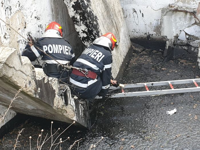 3 caini vagabonzi s-au prabusit in interior si nu mai reuseau sa iasa din mizeria vascoasa. Unul dintre catei a fost salvat de niste trecatori, iar ceilalti doi au fost recuperati de pompierii care au coborat in canal cu scari si funii.