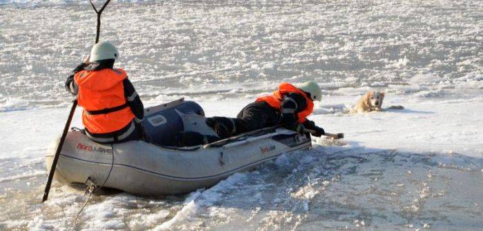 Dupa cateva zeci de mintute, cainele a fost scos dintre sloiuri si a fost predat femeii care alertase pompierii.