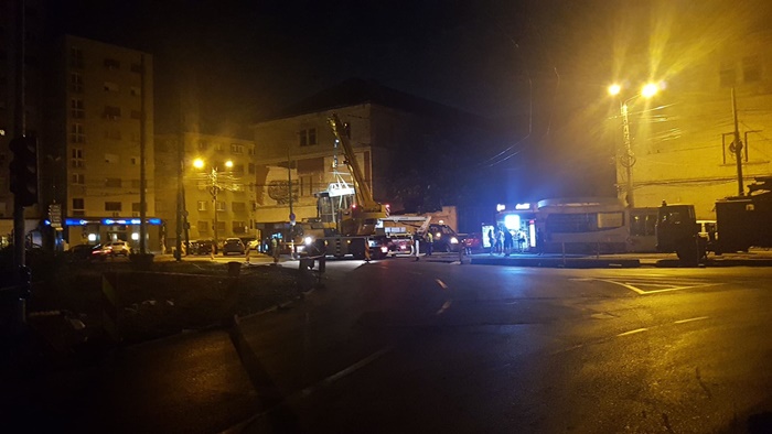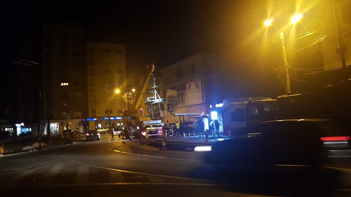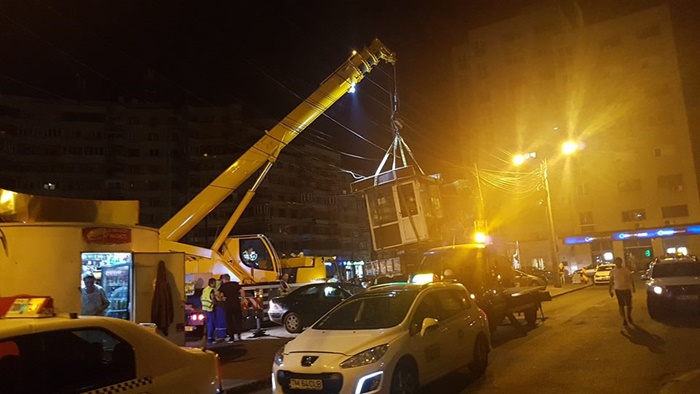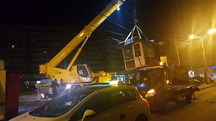 TIMISOARA. Mobilizare nocturna in Piata Marasti din Timisoara. Au fost aduse utilaje ale Societatii de Transport pentru ridicarea unui chiosc STPT.