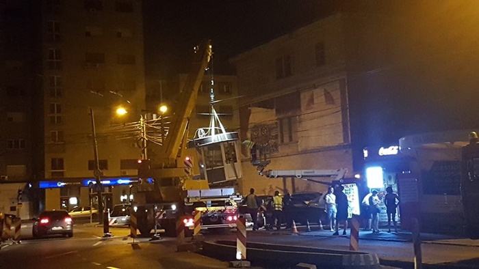 Cu ajutorul unei macarale, constructia a fost luata pe sus, urcata pe o platforma si transportata la un depozit al Societatii de Transport Public Timisoara.
