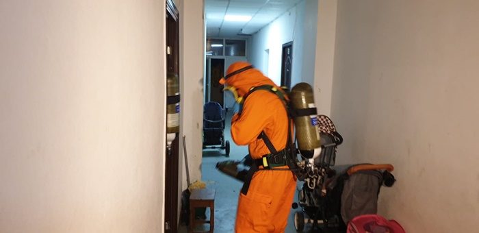 Echipele de cercetare Chimica, Biologica, Radiologica si Nucleara fac verificari amanuntite in blocul de garsoniere in care s-au petrecut tragediile.