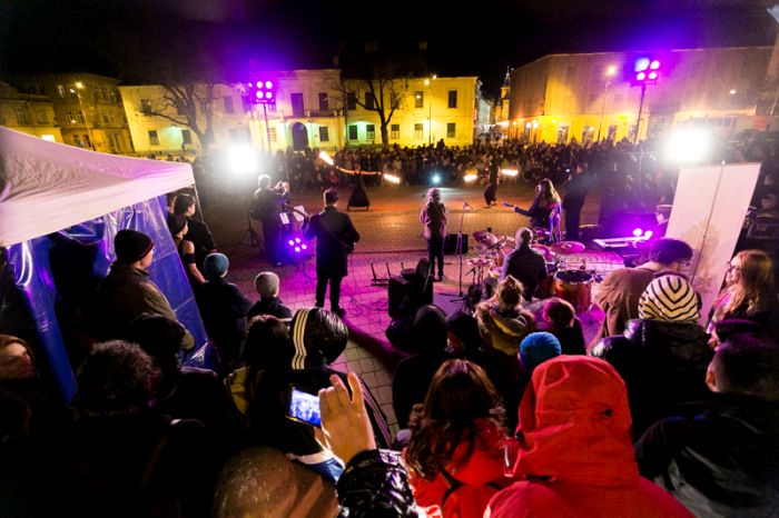 Spectacolul care a adunat sute de oameni a purtat numele „Elementele noptii” si s-a desfasurat in Piata Libertatii din Timisoara, noua piata de evenimente, fiind atent supravegheat de un echipaj de pompieri.