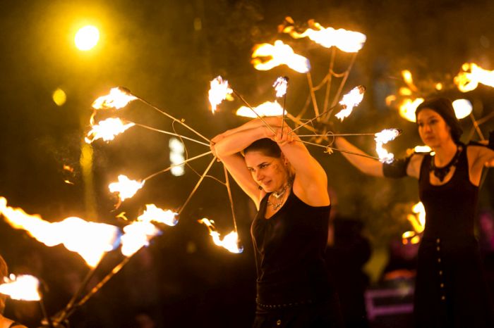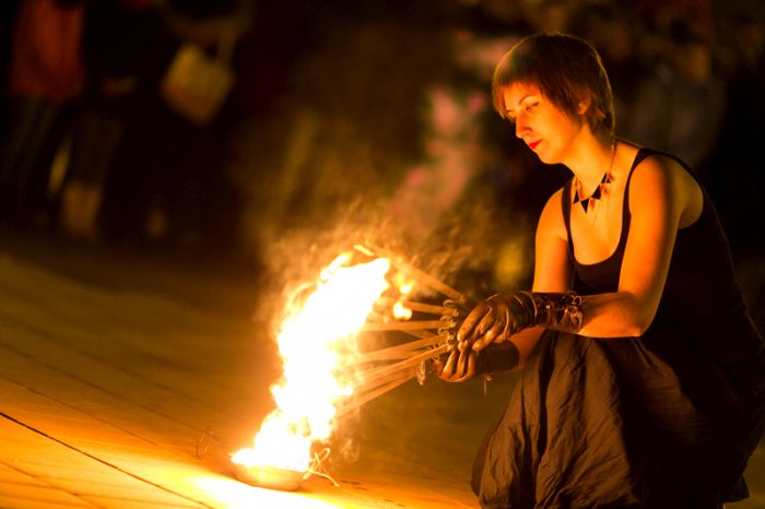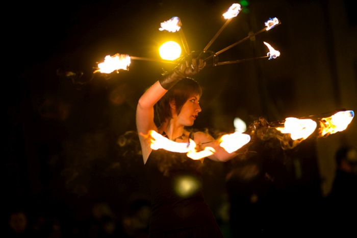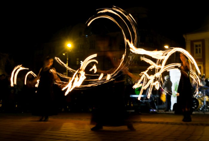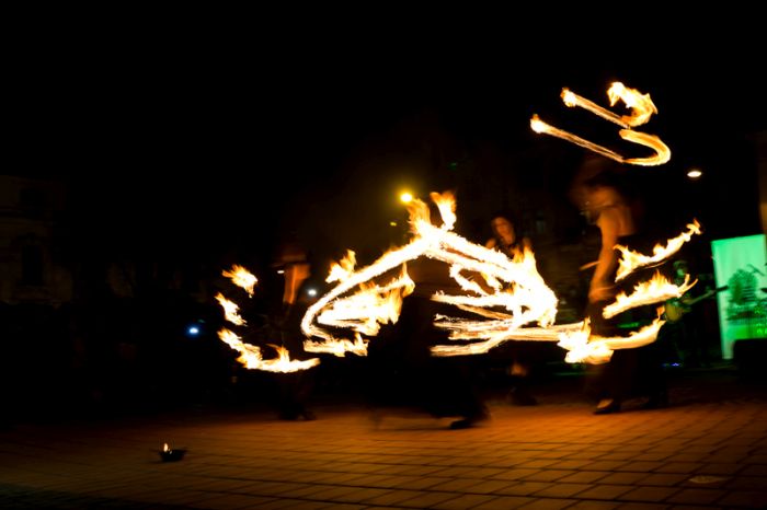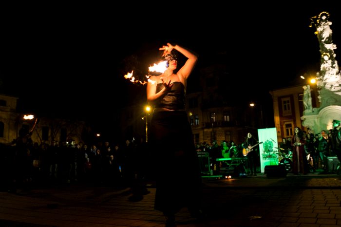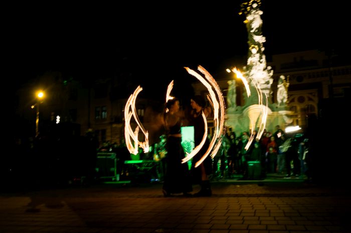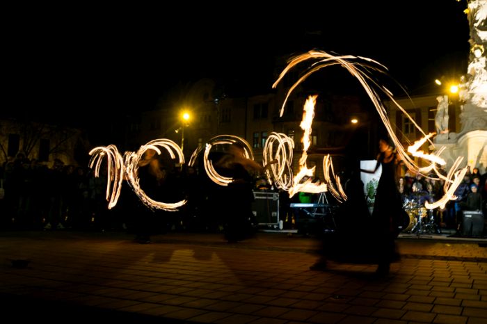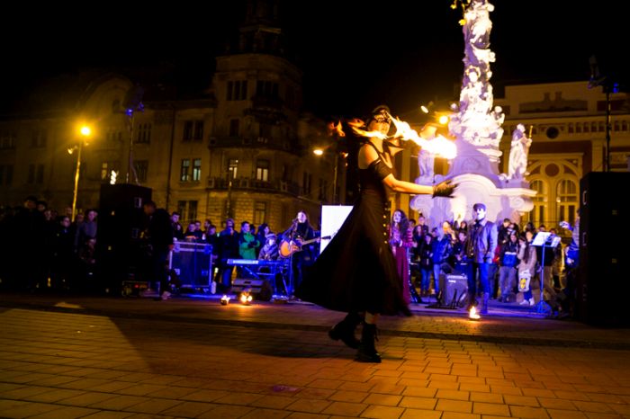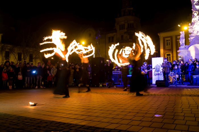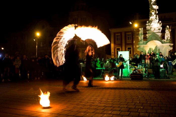 Spectacolul care a adunat sute de oameni a purtat numele “Elementele noptii” si s-a desfasurat in Piata Libertatii din Timisoara, noua piata de evenimente, fiind atent supravegheat de un echipaj de pompieri.
